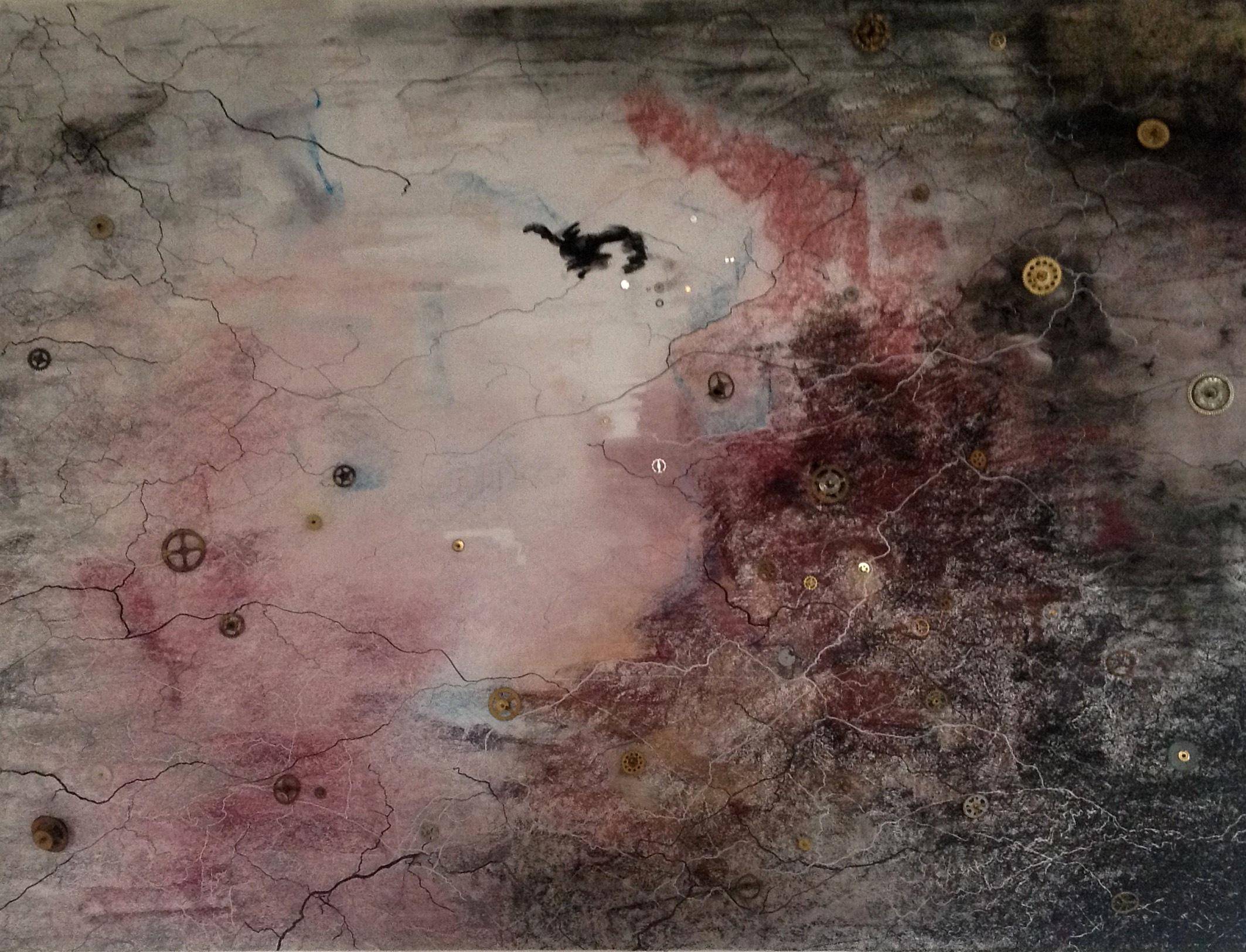 Obraz jest pełen zawirowań i subtelnych detali, których kolory oscylują między delikatnymi pastelami a głęboką, mroczną paletą. Dominują tu brudne odcienie szarości i bordo, które splatają się niczym nici w pajęczynie. Na pierwszy rzut oka widzimy przyciągującą uwagę przestrzeń, przypominającą mapa z osobliwym, industrialnym akcentem. Malarska technika artysty jest nieco chaotyczna, a zarazem hipnotyzująca, dzięki zastosowaniu różnych tekstur i kontrastujących barw. Crackle efekt na powierzchni obrazu wprowadza atmosferę starej, nieodkrytej historii. W istocie, dzieło emanuje tajemniczością. Czuje się lekki niepokój, ale jednocześnie fascynację. Może to nostalgia za minionymi czasami, a może echo przyszłości. Artysta wykorzystuje ten „roughness” by pokazać kruchość i jednocześnie siłę jakiejś nieznanej krainy. Ludzik na środku, jakby lecący smok, dodaje dynamizmu. Jakby dziecko wzięło kredki i próbowało opowiedzieć własną baśń. W każdym razie, każdy, kto patrzy, zostanie wciągnięty w wir myśli i uczuć. Ale co to znaczy? Może po prostu trzeba się zatrzymać i chwilę pomyśleć.