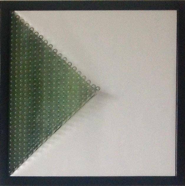 Na obrazie widzimy minimalistyczną kompozycję z dominującym trójkątem. Trójkąt w kolorze zielonym zrobiony z materiału przypominającego bubble wrap, co dodaje mu interesującej faktury. Tło jest czyste, białe, a skromna paleta kolorów sugeruje nowoczesność i prostotę. Trójkąt zdaje się "wchodzić" w białe tło, tworząc iluzję głębi lub odkrywania czegoś skrywanego. Atmosfera jest spokojna i harmonijna. To ten rodzaj obrazu, który przyciąga wzrok przez swoją prostotę, a jednocześnie zmusza do zatrzymania się na chwilę i przemyślenia, co kryje się za iluzją. Artysta wykorzystał techniki minimalistyczne, posługując się prostymi formami i ograniczoną paletą kolorów, co czyni dzieło nowoczesnym, a jednak intrygującym. Odbiorca może poczuć się zrelaksowany, a równocześnie zaintrygowany. Być może wywoła to w nim chęć "wchodzenia" głębiej w swoje własne myśli, tak jak trójkąt zdaje się przekraczać granice płótna. "This is so cool!" pomyślałoby dziecko, bo trójkąt przypomina mu ścigające się trójkąty z gier. Może to być zaproszenie do odkrycia własnej kreatywności. A te bąbelki to jak takie małe "dotknij mnie" dla wyobraźni. Obraz ten skłania do refleksji nad prostotą i pięknem ukrytym w codziennych materiałach.