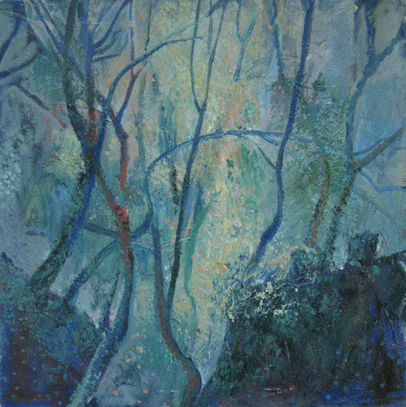 Na obrazie dominują chłodne odcienie niebieskiego i zielonego, przeplatane subtelnymi akcentami czerwieni i żółci, przywołującymi skojarzenie z mglistym lasem o świcie. Smukłe, wijące się linie, które przeplatają się w chaotycznej harmonii, przypominają gałęzie drzew, a może i marzenia nieuchwytne jak pajęcza nić. Atmosfera tego dzieła jest tajemnicza, jakby otulała widza delikatną mgiełką nostalgii i spokoju. Czuję się, jakbym był w lesie! Styl artysty przywodzi na myśl impresjonizm, z pewną dozą spontanicznej ekspresji visible w dynamicznych pociągnięciach pędzla. Wzbudza to wiele emocji; od spokoju po lekki niepokój, jakby kryło się tu coś magicznego. Może to sen tajemniczy, a może wspomnienie z dzieciństwa... Trudno mi to określić, ale obraz naprawdę oddziałuje na zmysły, wciągając w świat ciszy i refleksji. Patrząc, mam ochotę zanurzyć się w tej głębi koloru, odkrywać każdy zakamarek malowanej przestrzeni. A może to las, w którym bawiłem się jako dziecko? Takie myśli snują się po głowie, gdy patrzę na to intrygujące dzieło. W pełni zasługujące na miano „enchanting”, bo przecież takie właśnie jest, nieprawdaż?