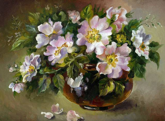 Na obrazie widzimy piękną kompozycję kwiatów w glinianym wazonie. Dominuje miękka paleta barw – delikatne róże i zielenie mieszają się z cieplejszymi odcieniami brązów. Kwiaty, niczym baśniowe postacie, rozkwitają, rozlewając się w różne strony. Liście przeplatają się, ukazując różnorodność kształtów i odcieni. Patrząc na to, odczuwam spokój i ciepło wiejskiego ogrodu w letnie popołudnie. Luz, który emanuje z obrazu, sprawia, że zapomina się o codziennych troskach. Artysta posługuje się techniką impasto, co nadaje teksturę i głębię dziełu. Grube warstwy farby tworzą efekt trójwymiarowości, a lekko rozmyte kontury, jakby rozmyślnie niedbałe, dodają obrazu impresjonistycznego uroku. Czuje się radość i lekkość – trochę jak w bajce. "Flowers are pretty," powiedziałoby na pewno małe dziecko, i miało by rację. Ten obraz to nie tylko wizualna przyjemność, ale także emocjonalne doświadczenie. Zmusza widza do refleksji nad ulotnością piękna, nad chwilami, które cieszą oko i duszę. Taka estetyczna podróż, która porusza serce i wyobraźnie. Przywodzi na myśl wspomnienia z dzieciństwa, kiedy to biegało się boso po łąkach pełnych kolorowych kwiatów.