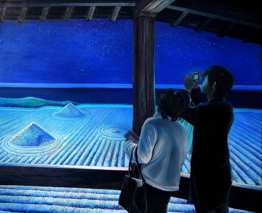 Na tym magicznym obrazie dominuje głęboki, hipnotyzujący odcień niebieskiego. Nocne niebo pełne gwiazd kontrastuje z jasnym piaskiem ułożonym w perfekcyjne stożki, które wyglądają jak miniaturowe góry. Kompozycja prowadzi wzrok na horyzont, gdzie morze zdaje się spotykać z niebem. Atmosfera jest spokojna, niemal mistyczna. Czuję się, jakby czas zatrzymał się na chwilę. Artyści użyli subtelnych pociągnięć pędzla, które dodają tekstury i głębi. Coś jak "Wow" w powietrzu wisi. Można się zasłuchać w szum wiatru lub ciche rozmowy widoczne w oddali. Obraz emanuje spokojem, co jest naprawdę odprężające. Może skłaniać do refleksji na temat nieskończoności i chwilowego piękna świata. Jest taki moment, że chce się po prostu patrzeć bez końca. Dzieciakom mogłoby się spodobać to, że wygląda jak trochę z bajki. Technika mieszania kolorów i światła jest what you call breathtaking. Widać precyzję i delikatność pędzla. To istna uczta dla oczu, która wywołuje wrażenie zanurzenia w innym świecie.