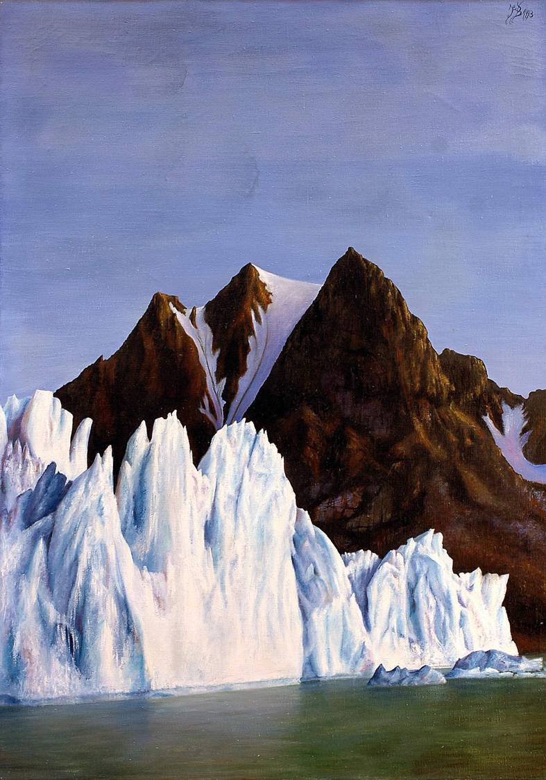 Obraz przedstawia majestatyczny górski krajobraz, w którym dominują lodowce i skaliste szczyty. Tło zdobi głęboki błękit nieba, który kontrastuje z ciemnymi, niemal czarnymi wierzchołkami gór. Lodowce wydają się niemalże rozświetlać całość swoim zimnym blaskiem, rzucając błękitne cienie na otaczającą je wodę. Kompozycja jest wyważona, z górą dumnie wznoszącą się ku górze, co nadaje dziełu harmonii. Atmosfera obrazu jest spokojna, ale i surowa, jakby czas się zatrzymał w tym odległym zakątku świata. Artysta używa gładkich pociągnięć pędzla, co wprowadza lekkość i płynność, jednocześnie podkreślając detale lodowych formacji. Użycie techniki olejnej pozwala na intensywne odwzorowanie kolorów i faktur. Wpatrując się w tę scenerię, można poczuć chłód bijący od lodowców. To takie Beautiful, zwłaszcza kiedy myśli się o skali tego krajobrazu. Taki widok wzbudza zachwyt, ale i respekt przed naturą. Patrząc na lodowe szczyty, czujesz się jak mały podróżnik odkrywający wielki świat, mrucząc: "Ale góry są duże!" Pastelowe odcienie lodu i ciemniejsze barwy skał tworzą kontrast, który przyciąga wzrok i każe zanurzyć się w refleksji nad pięknem naszego świata.