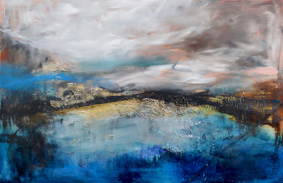 Obraz Iwony Borkowskiej „W miejscu, gdzie milknie wiatr” to jak niespodziewana podróż w nieznane — pełna tajemniczych barw i kształtów, które zapraszają do zanurzenia się w przestrzeni zawieszonej pomiędzy niebem a wodą. Chmury, rozlewające się szeroko w odcieniach szarości, zwiastują nadchodzącą burzę, ale zarazem przywołują spokój. Może to niebo nad górskim jeziorem? W dolnej części obrazu odbijają się błękity i turkusy, łagodzące surowość nieba i natury powyżej. To dzieło pełne kontrastów. Z jednej strony czuć ciszę i spokój, z drugiej — ukrytą, nieokiełznaną siłę natury, która wciąga w swój wir. Pierwsze wrażenie jest jak „wow” — zaskakujące, zapierające dech, jakby patrzeć na młode fale, które zaczynają swoją podróż, lub szeleszczące liście poruszone przez wiatr. Artystka wykorzystuje techniki mieszające grubą fakturę z delikatnymi pociągnięciami pędzla, co dodaje głębi i trójwymiarowości. Obraz przypomina marzenie, które chcemy zrozumieć, ale nigdy do końca nie możemy — jak fragment rzeczywistości, który nie ma jednoznacznych granic. Obraz skłania do zatrzymania się, do chwili refleksji. W tej kompozycji czuć zarówno chaos, jak i harmonię — jak w życiu: trochę unbalanced, ale na swój sposób perfekcyjne.
