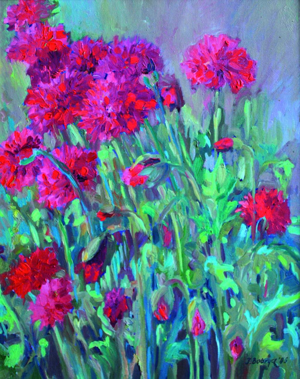Obraz tętni życiem i feerią kolorów, w której dominują intensywne czerwienie kwiatów otoczone soczystą zielenią łodyg i liści. W tle pojawia się delikatny odcień niebieskiego, który dodaje głębi całej kompozycji. Kwiaty wyglądają jakby tańczyły na wietrze, ich płatki są dynamiczne i pełne energii. Artysta zastosował technikę impasto, nakładając farbę grubymi warstwami, co daje efekt trójwymiarowości i tekstury. Samo patrzenie na ten obraz podnosi na duchu, jakby przypominał o radościach prostego życia. "Look, mamo, one się śmieją!" - mógłby powiedzieć dzieciak. Atmosfera emanuje ciepłem i optymizmem, tak że aż chce się tam zostać na dłużej. Artysta chwyta chwilę pełną witalności, a odbiorca może poczuć się częścią tego uniwersum. Te kolory - takie żywe i pełne pasji - potrafią rozświetlić nawet najciemniejszy dzień. Ostatecznie, obraz działa jak reminder o pięknie natury, które często ignorujemy w codziennym biegu.