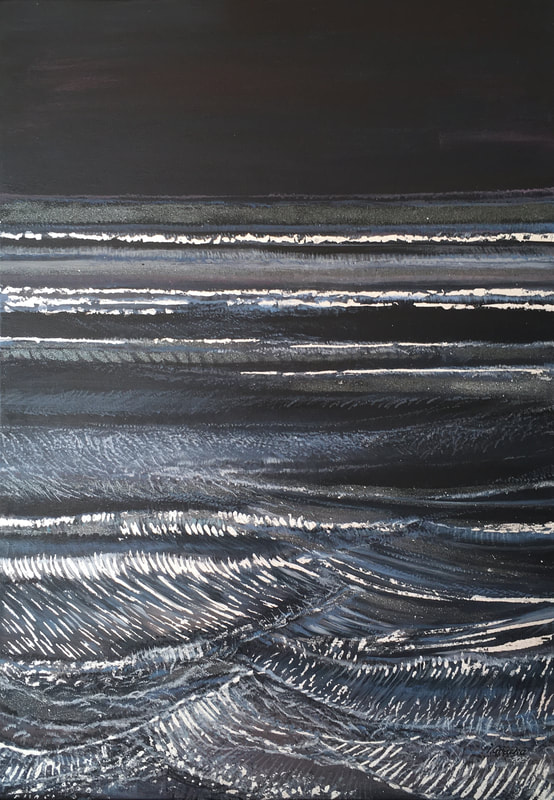 Obraz przedstawia falujące morskie wody, rozpościerające się aż po horyzont. Dominują tu głębokie odcienie granatu i czerni, które przeplatają się z bielą, tworząc dynamiczne linie przypominające morską pianę. Kompozycja jest pozioma, co potęguje wrażenie przestrzeni i nieskończoności. Wrażenie migotającej wody i światła ślizgającego się po falach spotęgowane jest poprzez użycie przez artystkę stalowych, błyszczących opiłków oraz fragmentów srebrnego szlagmetalu. Obraz ma coś magnetyzującego, przyciąga wzrok i nie chce go puścić. Stylistyka jest minimalistyczna, lecz niepozbawiona głębi emocjonalnej. Można tu dostrzec wpływy abstrakcji, które dodają mu nowoczesnego charakteru. Gdy patrzę na te fale, czuję jakby czas się zatrzymał. Jakby świat na chwilę zamarł. Mogłoby to być tak, że zaplątałem się w tej przestrzeni, zastanawiając, co będzie dalej. Ciekawe, jakby to było wejść do wody, co? W tej wizji czuć nieskończoną wolność i nieograniczoność.