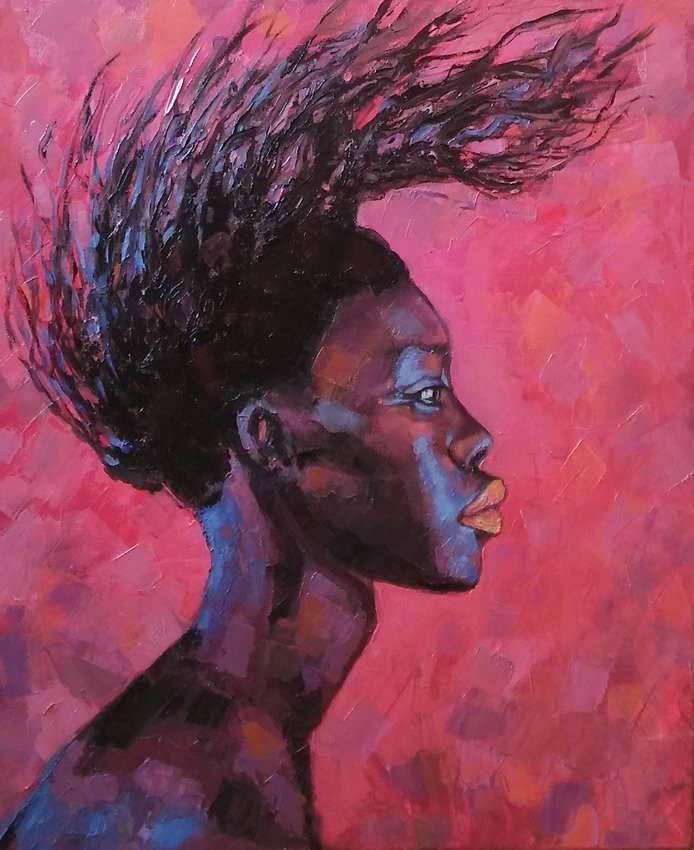 Ekspresyjny obraz z otwartego cyklu malarskiego -"Kobiety czarnego lądu", rozpoczętego w 2015r. Namalowany szpachelką, energetycznymi kolorami portret, przedstawia zamyśloną kobietę o ciekawej , mocnej urodzie. Jej żywiołowość i demonizm podkreśla faktura płótna i mocne, kontrastowe momentami zestawienia kolorystyczne. Portret ten stanowić będzie ciekawy akcent tematyczny i kolorystyczny we wnętrzu salonu, gabinetu czy też biura. Obraz może też być niebanalnym prezentem dla miłośnika podróży, egzotyki lub po prostu lubiącego sztukę nowoczesną.
