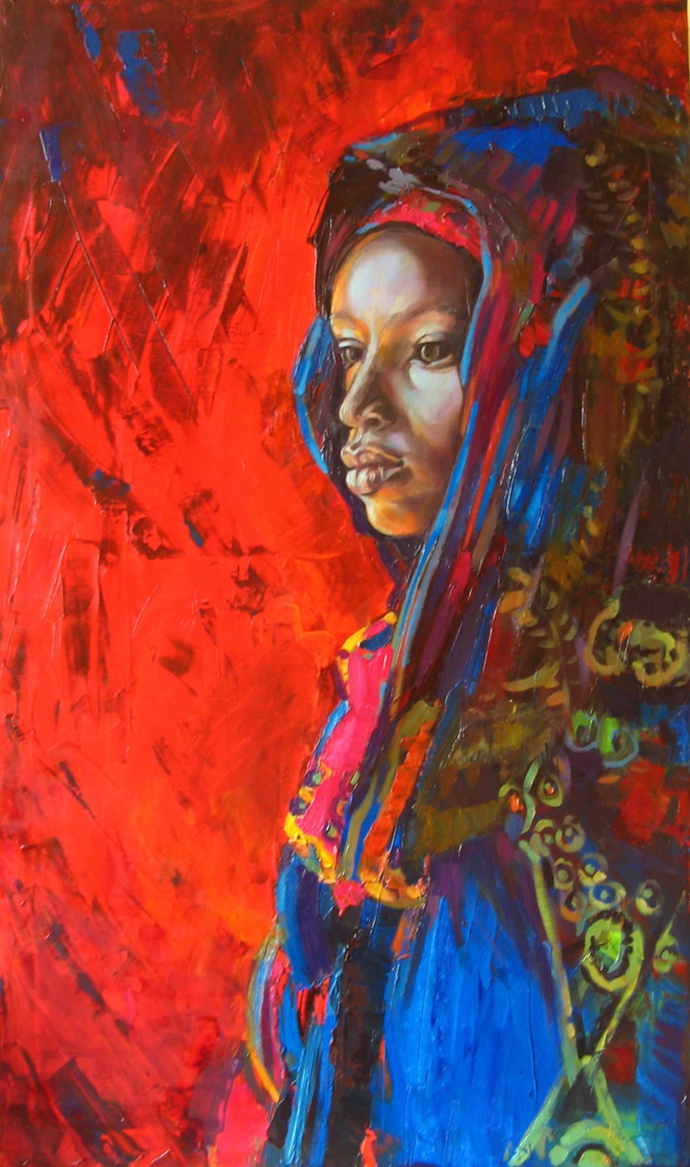 Obraz z cyklu "Kobiety czarnego lądu". Energetyczny portret murzynki w dekoracyjnej chuście.Malowany częściowo szpachelką posiada ciekawą fakturę.