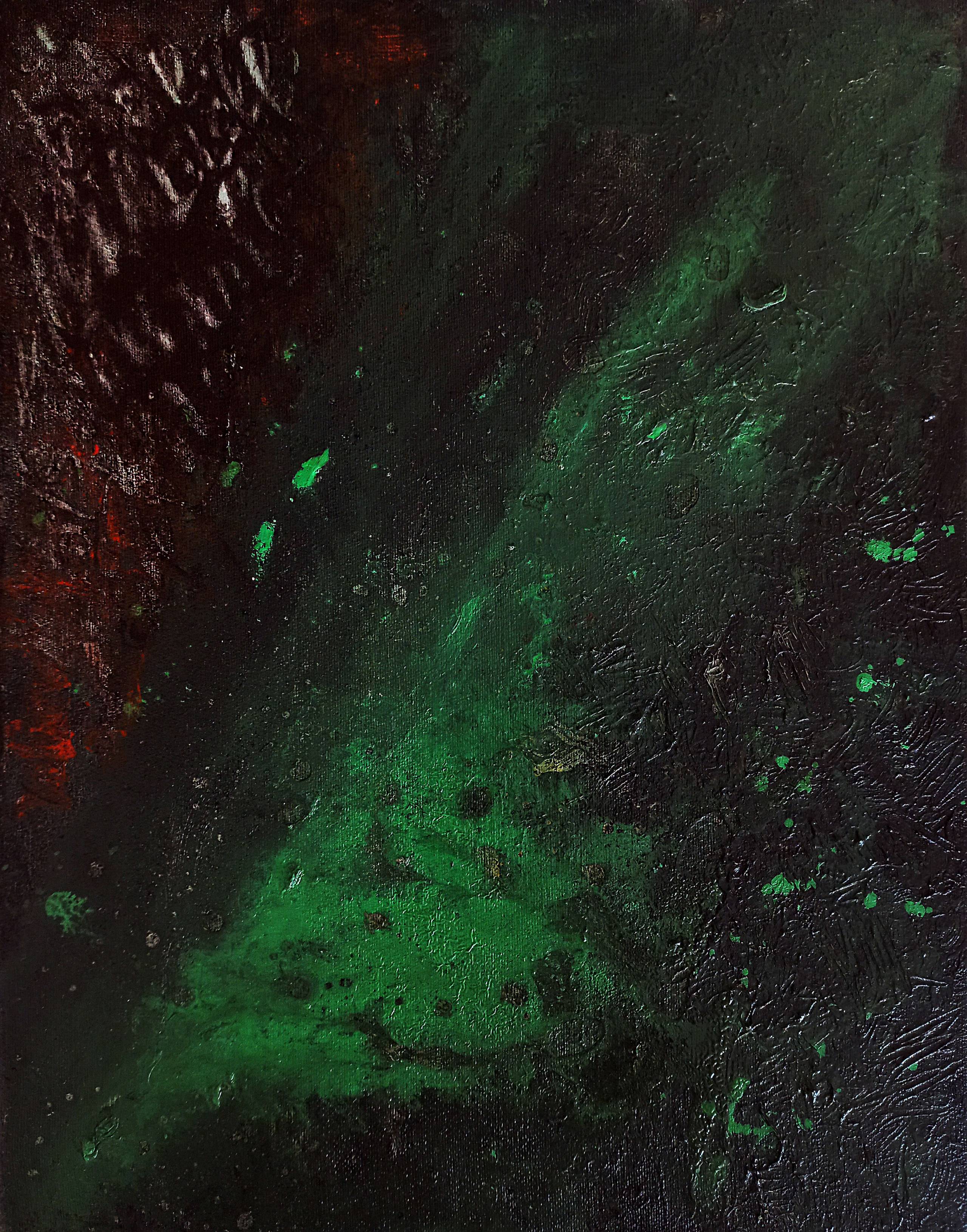 W abstrakcyjno-surrealistycznym cyklu malarskim pn. "Implementacja natury" artystka porusza problem współczesnego zarządzania środowiskiem naturalnym. Obrazy te odzwierciedlają jej obawy dotyczące destrukcyjnych działań wobec natury oraz paradoksów związanych z ekologią. Zadaje pytania o rzeczywistość, w której żyjemy: Jak daleko może sięgać ludzka ingerencja w naturę? Emocje, które towarzyszą temu zagadnieniu, są złożone – od radości po smutek i bezradność. Paleta kolorów prac skupia się na odcieniach zieleni i brązu, z akcentami oranżu w postaci haseł związanych z ekologią i źródłami energii. Kolory zieleni i brązu symbolizują naturę, ziemię, oraz ekologię, co jest związane z dbałością o środowisko i zrównoważonym rozwojem. Zieleń często kojarzy się z roślinnością, zdrowiem i harmonią, podczas gdy brąz reprezentuje stabilność, ugruntowanie i naturalne materiały. Akcenty oranżu, które pojawiają się w formie haseł, pełnią rolę wyróżniającą oraz przyciągającą uwagę. Kolor pomarańczowy jest energetyczny, co symbolizuje innowacyjne źródła energii. Takie kontrasty mogą również podkreślać konflikt lub współistnienie między naturą a technologią. W ten sposób, użycie tych kolorów jest przemyślane, mające na celu stworzenie wizualnego dialogu na temat ochrony środowiska i innowacji w dziedzinie energii. Obrazy te, mogą zachęcać do refleksji nad relacją człowieka z naturą oraz nad przyszłością zrównoważonego rozwoju. Wszyscy cenimy kontakt z naturą, spędzając czas w otoczeniu zieleni. Jednak rosnące zagrożenia, takie jak wylesianie, nieodpowiedzialny rozwój infrastruktury czy nadmierny konsumpcjonizm, mogą ograniczyć nasze możliwości obcowania z przyrodą. Problem ten dotyka nie tylko naszego zdrowia psychicznego, ale i przyszłości naturalnych krajobrazów. Czy wkrótce będziemy musieli szukać prawdziwej natury jedynie w rezerwatach? Odpowiedzi na te pytania kryją się w przyszłości, a my musimy zacząć podejmować świadome decyzje już teraz.