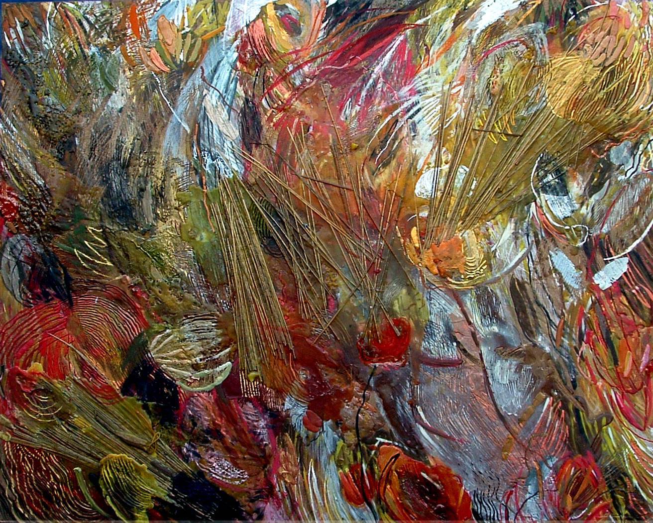 Obraz, który mamy przed sobą, to prawdziwa uczta dla oczu. Feeria kolorów – od intensywnej czerwieni, przez głębokie zielenie, aż po subtelne odcienie złota – tworzy dynamiczną kompozycję. Przypomina chaos natury, burzę uczuć zamkniętą na płótnie. Kształty są nieokreślone, co daje pole do popisu wyobraźni. Wzory przypominają wirujące liście lub płomienie. Artysta zastosował technikę impasto, nanosząc grubą warstwę farby, dającą wrażenie głębi i trójwymiarowości. To "texture" pod palcami! Atmosfera dzieła pulsuje energią, zachęca do refleksji. Może pobudzać odwagę lub niepokój, w zależności od patrzącego. Taki obraz może wywołać różne emocje w różnych osobach – od zachwytu po niepewność. Wiesz, to taka "dziecięcość" wizji; jakby wrócić do czasów, gdy patrzyło się na wszystko z fascynacją. Dziecko by pewnie powiedziało: "To jak kolorowa burza na niebie!” Formalnie opowieść z tego obrazu może mówić o burzliwym tańcu natury. Jednocześnie ten chaos ma coś hipnotyzującego. Osobiście wydaje mi się, że to opowieść o sile życia. Warto zatrzymać się na chwilę, wejść w ten świat i dać się ponieść jego rytmowi. W końcu, sztuka to podróż, której kierunek wybierasz sam.
