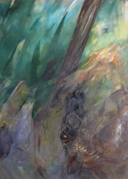 Obraz emanuje delikatnym chaosem, niczym natura rozbudzona do życia po deszczu. Dominują na nim zielone i brązowe barwy, które przenikają się w pełnej dynamicznych ruchów kompozycji. Nieokreślone kształty, jakby rozmazane ręką artysty, nadają dziełu tajemniczości. Atmosfera jest pełna niewyraźnych emocji, jakby obraz chciał coś powiedzieć, ale nie do końca wiedział co. Trochę melancholijne, a jednocześnie z jakąś nieuchwytną nadzieją. Artysta posłużył się techniką impastu, nadając płótnu struktury i głębi. Dynamiczne pociągnięcia pędzla, przypominają leniwe chwile, kiedy czas płynie wolniej. Jest w tym coś prawdziwie surrealistycznego. Można tu poczuć echo ekspresjonizmu, ale jednocześnie coś bliskiego naturalizmowi. To obraz, który można interpretować na wiele sposobów. Jedna osoba zobaczy w nim pasmo gór, inna mglistą dolinę. Ja myślę, że to wygląda, jakby strach się bawił w chowanego. Występuje tu mieszanka kolorów jak w "kaleidoscope". Obraz wydaje się mówić coś o ludzkiej naturze, o naszych ukrytych pragnieniach i emocjach, które często są tylko cieniem. Gdybym miał ten obraz w domu, sięgałbym po niego zawsze wtedy, gdy moje myśli błądzą. To jak spojrzenie w głąb własnej duszy.