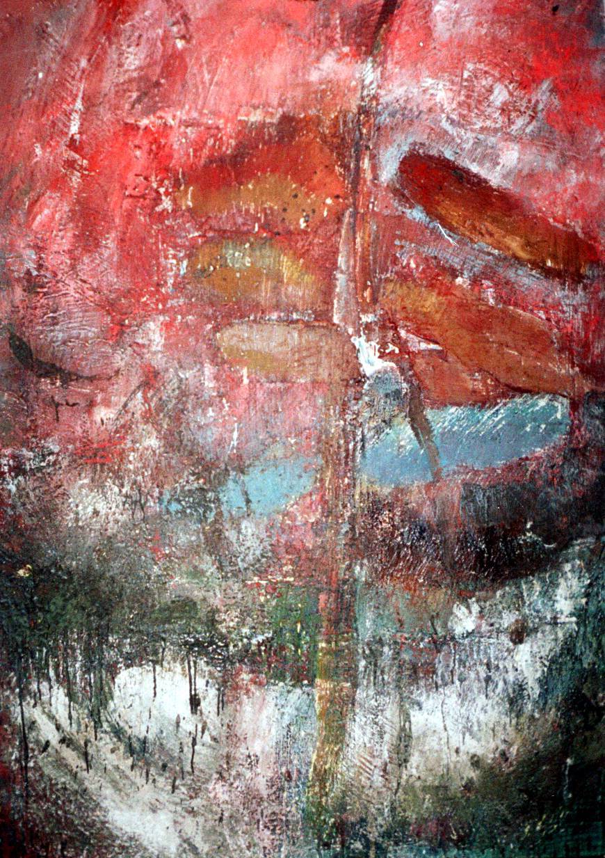 Ten obraz to prawdziwa feeria barw. Dominują ciepłe odcienie czerwieni i pomarańczu, tworząc dynamiczną i ekspresyjną kompozycję. W tle pojawiają się chłodniejsze kolory, jak niebieski i biały, co wprowadza kontrast i dodaje głębi. Struktura kompozycji jest chaotyczna, ale właśnie w tym chaosie tkwi piękno – jakby ktoś przelewał emocje prosto na płótno. Atmosfera, która z niego bije, jest pełna pasji i energii. Można prawie poczuć ruch, jakby farba wciąż się poruszała i zmieniała. Technika użyta przez artystę jest niezwykle sugestywna, prawdopodobnie to impastowy styl, gdzie grubo nakładana farba tworzy teksturę, niemal zapraszającą do dotknięcia dzieła. Patrząc na to dzieło, można poczuć się przytłoczonym, ale jednocześnie zafascynowanym. To trochę jak rollercoaster – niby strasznie, ale jednocześnie ekscytująco. Odbiorca może interpretować ten obraz na wiele sposobów, każdy dostrzeże coś innego. "Wow, kolory są jak lody!" - mógłby powiedzieć 7-latek, oczarowany tą kolorystyczną eksplozją. Osobiście, obraz budzi we mnie poczucie tajemnicy i odkrywania nieznanego. Spojrzenie na to artystyczne "mash-up" sprawia, że czuję się zainspirowany i pełen energii. To prawdziwy feast for the eyes.