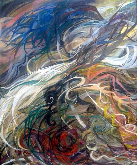 Wow, ten obraz to prawdziwy wir kolorów i kształtów. Dominują tutaj odcienie błękitu, bieli i czerwieni, które splatają się w dynamiczny taniec. Widać tu jakieś zawijasy i esy-floresy, które przypominają niesforne loki włosów albo tańczący wiatr. Kompozycja jest chaotyczna, ale w jakiś sposób harmonijna. Emanuje z tego dzieła poczucie ruchu i energii, jakby wszystko było w nieustannym pędzie. Technika, jaką zastosował artysta, to gra świateł i cieni z dynamicznym użyciem pędzla. Wydaje się, że farba została nanoszona z żywiołowością, a pociągnięcia pędzla są wyraźnie widoczne, nadając obrazowi unikalną teksturę. Ten styl to chyba jakieś artful chaos. Taa, to zdecydowanie pasuje. Patrząc na to, można poczuć coś pomiędzy zachwytem a lekkim niepokojem. Obraz może przywoływać uczucia ekscytacji, ale też pewnego zagubienia. To jak wchodzenie w nieznane. Czuję, jakby artysta chciał pokazać wewnętrzny bałagan, emocjonalny kocioł, który czasem wszyscy mamy w głowie. No, może trochę pokręcone, ale co tam. Moje osobiste wrażenie? Jest jak fala, która porywa cię ze sobą, nie do końca wiesz dokąd, ale czujesz, że to będzie niezła przygoda. Czy ten obraz wywoła uśmiech? Definitely.