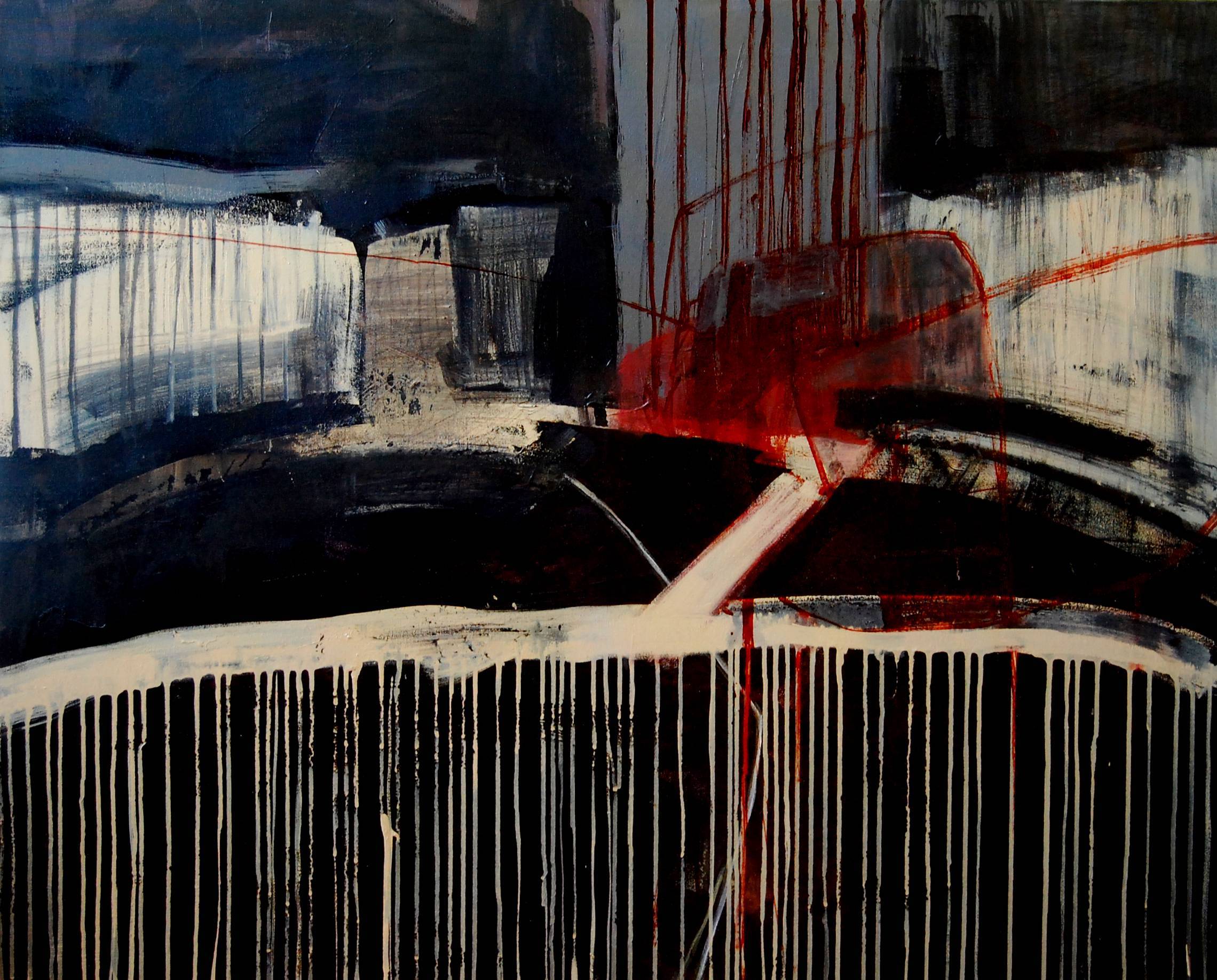 Akryl na płótnie. Odważna kompozycja z czerwoną dominantą. Ekspresyjna interpretacja pejzażu miejskiego budowana malarską plamą przeplataną subtelną kreską. Takie połączenie nadaje pracy graficzny charakter.