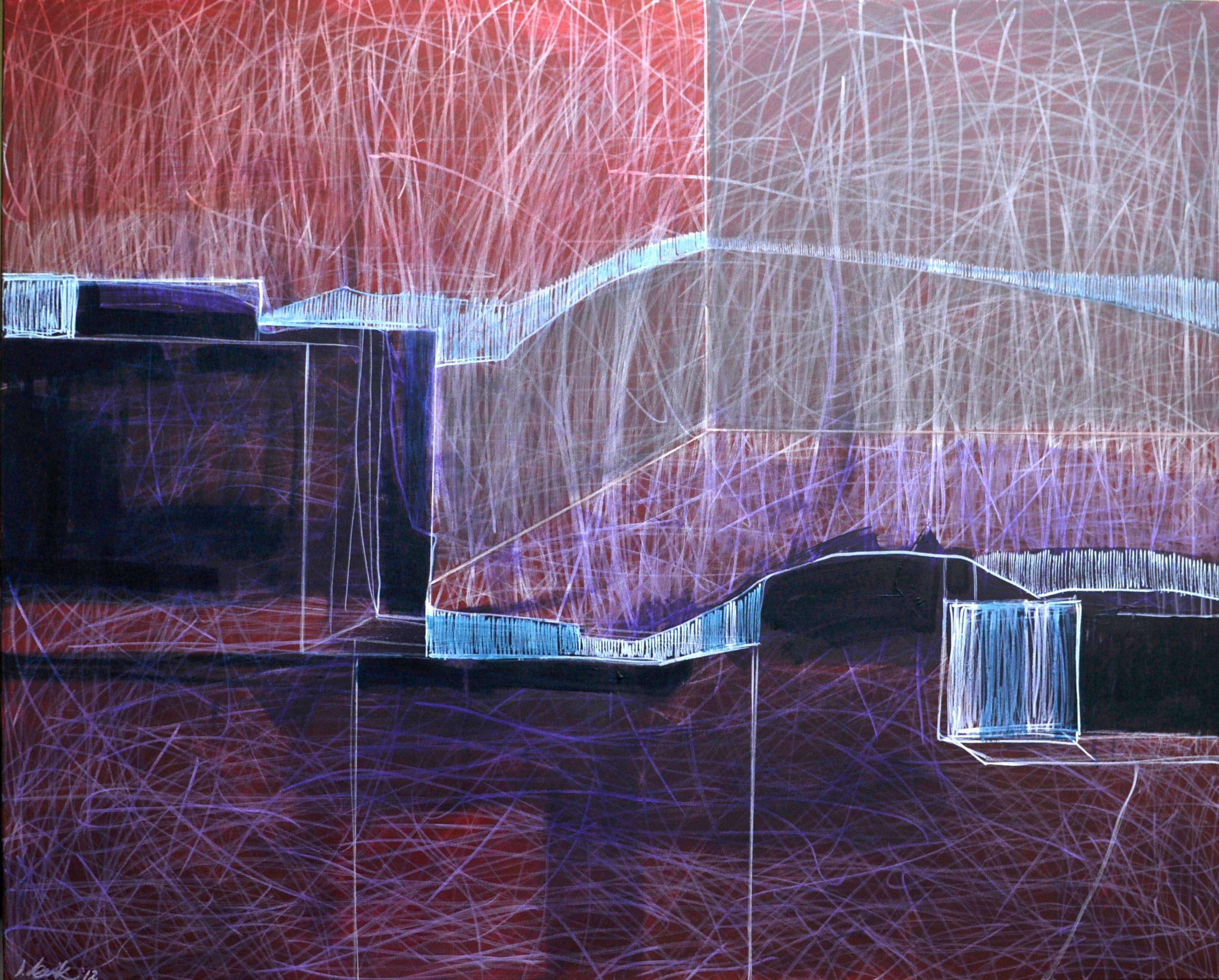 Obraz przyciąga wzrok mieszanką czerwieni, fioletu i odcieni szarości, tworząc harmonijną, ale też trochę chaotyczną kompozycję. Linie, zarówno proste, jak i zakrzywione, przecinają płótno, tworząc poczucie ruchu i niepewności. Ten wizualny chaos wydaje się prowadzić widza w nieznane rejony — it's quite mesmerizing! Atmosfera jest napięta, ale nie przygnębiająca, wprowadza pewne napięcie, które trudno zignorować. Styl artysty jest zdecydowanie abstrakcyjny, z wyraźnym naciskiem na linię i formę. Mamy tu grę światła i cienia, co dodaje głębi i tajemniczości. Dzieciak powiedziałby może: „To wygląda jak kosmiczne zamieszanie!”. Emocje, które wywołuje obraz, są różnorodne. Jedni poczują spokój i zachwyt, inni rozdrażnienie. Każda interpretacja jest ważna, bo sztuka to osobiste przeżycie. Refleksja nachodzi mnie, że to przypomina trochę nasze codzienne życie — pełne zakrętów i kolorów, gdzie każdy dzień malujemy na nowo. To dzieło sztuki uczy, że nie wszystko musi być jasno określone, czasem warto zatrzymać się i podziwiać chaos.