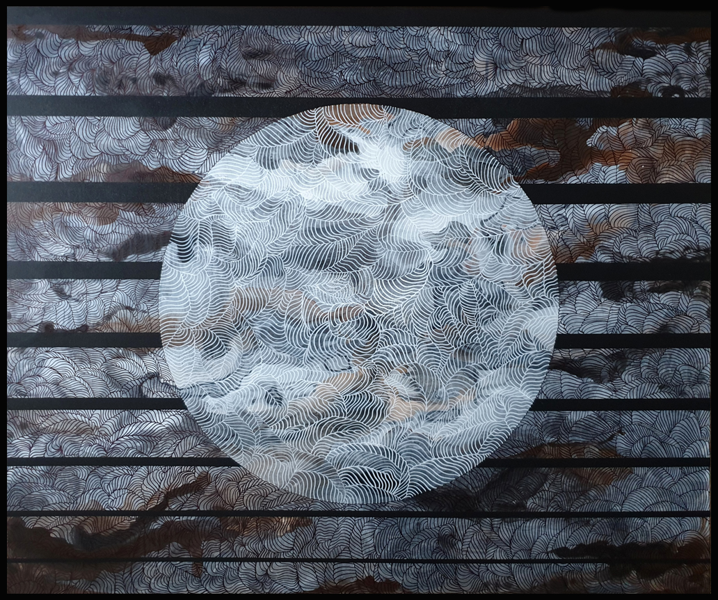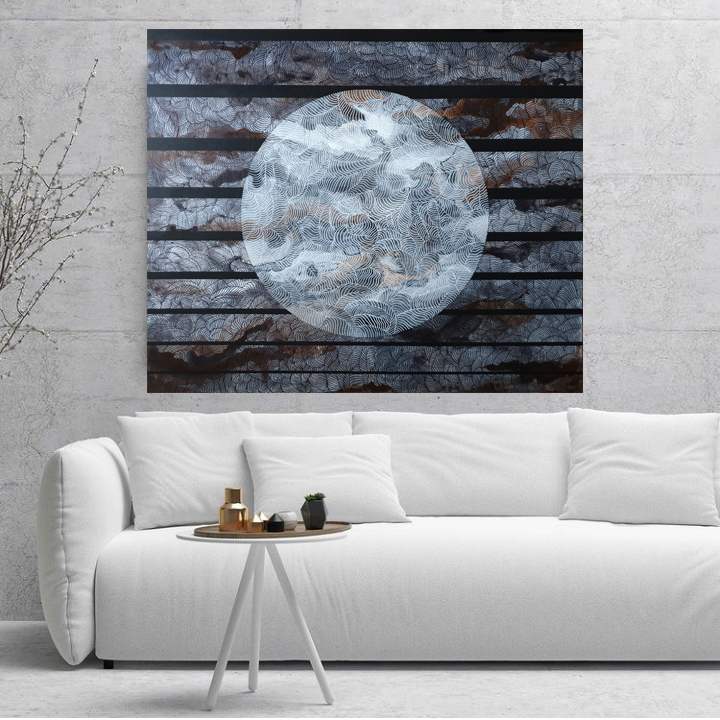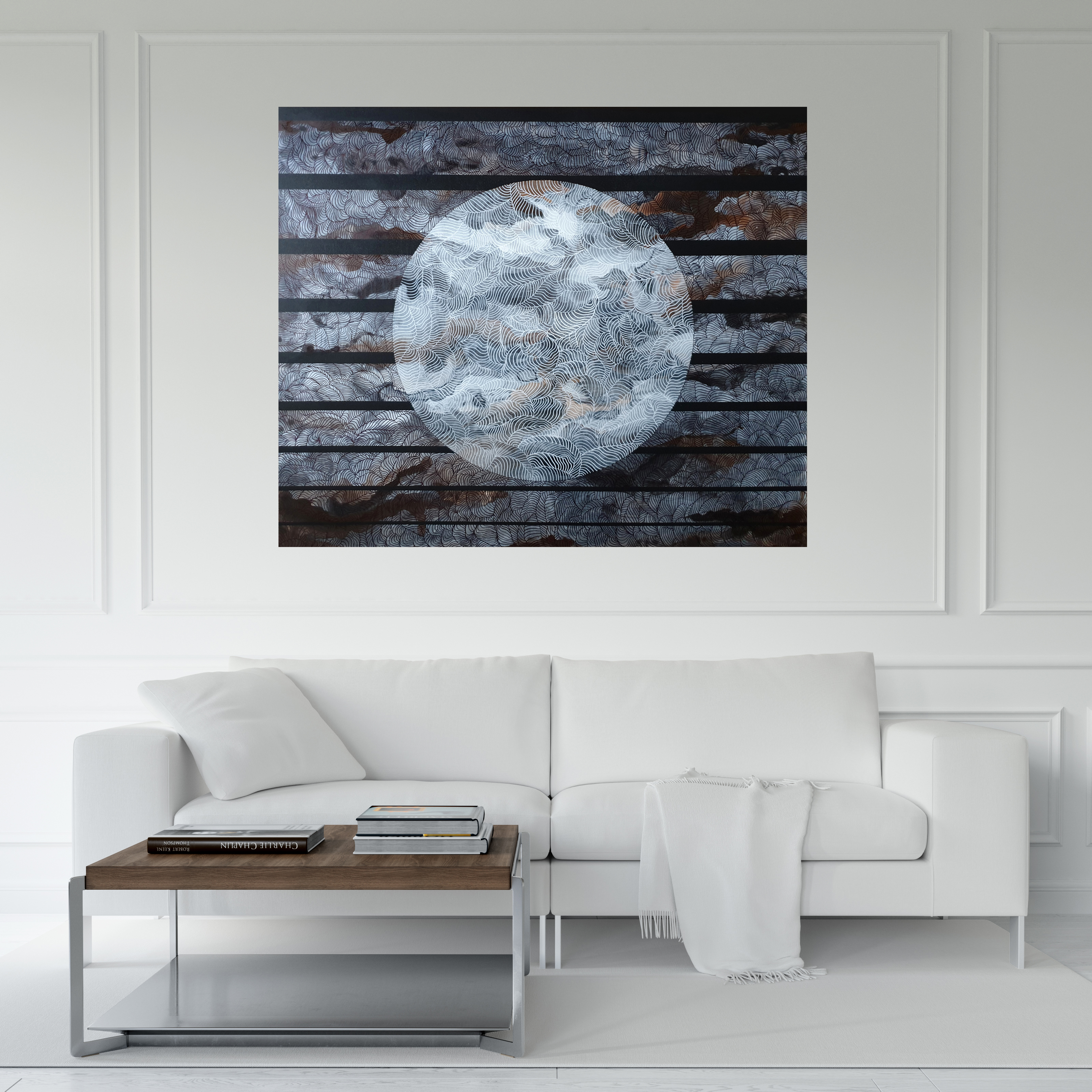 Ten obraz to istny taniec kształtów i kolorów. Na pierwszy rzut oka przyciąga uwagę duże koło umieszczone centralnie, wypełnione falistymi, białymi liniami przypominającymi chmury. Tło jest ciemne, z dominującymi odcieniami brązu i szarości, poprzecinane horyzontalnymi, czarnymi pasami, które nadają dziełu rytmiczny puls. Całość sprawia wrażenie jakiejś tajemnicy z odrobiną melancholii. Można poczuć, jakby to była wizja galaktyki albo czas i przestrzeń w jednym momencie. Artysta używa delikatnych pociągnięć pędzla, tworząc misterną, niemalże hipnotyzującą teksturę. Wow. Chciałoby się wejść do środka i zatopić w tej miękkiej abstrakcji. Obrazy takie jak ten wywołują poczucie spokoju, ale i mały dreszczyk emocji. Kto powiedział, że obrazy nie mogą mówić? One szepczą do nas historie, a ten jest jak „calm before the storm”. Może to ich kołyszące linie, a może ta tajemnicza ciemność w tle, sprawiają, że czuję się, jakbym patrzyła na jakąś mapę świadomości. To arcydzieło nie jest tylko do oglądania, ale do przeżywania.