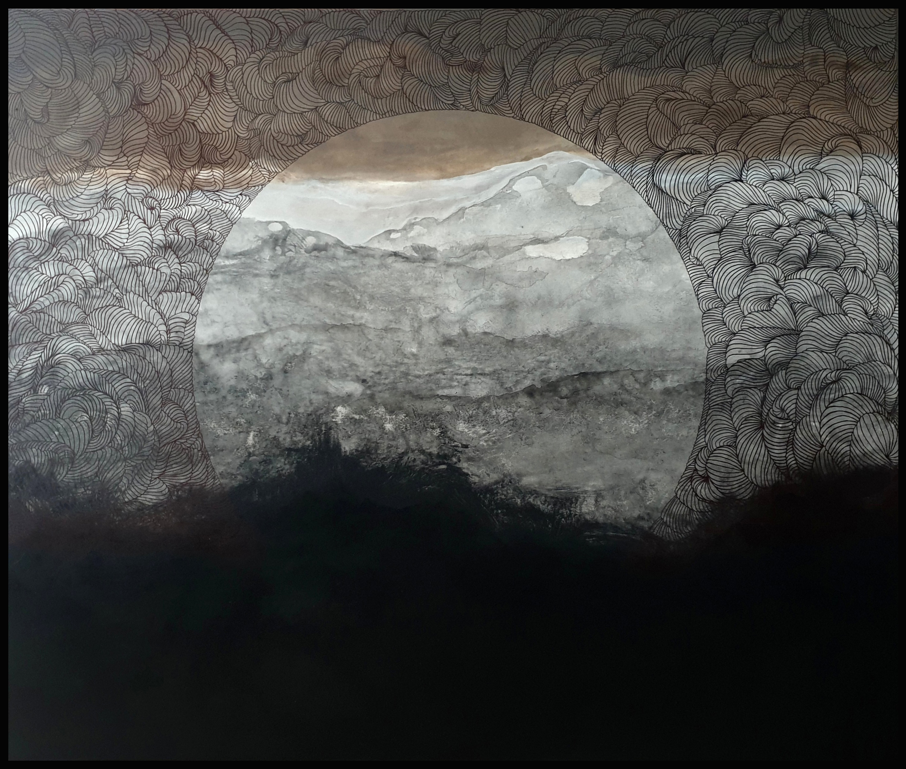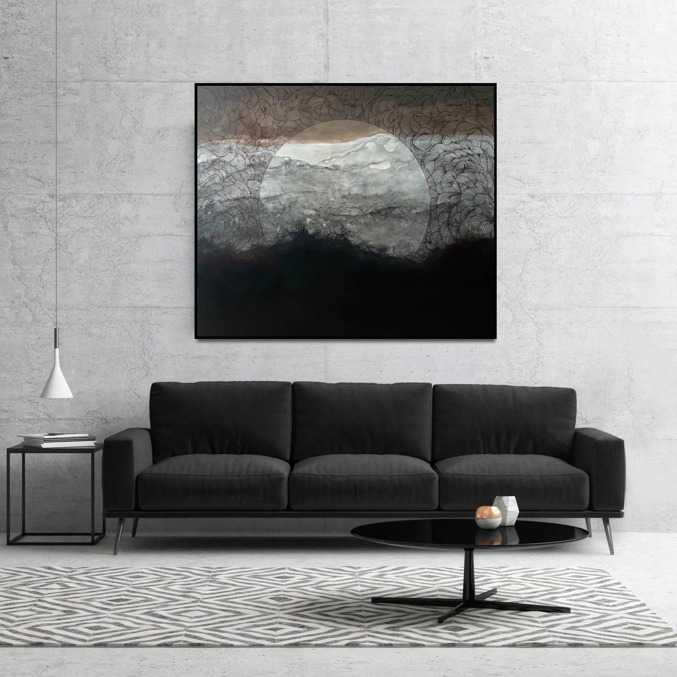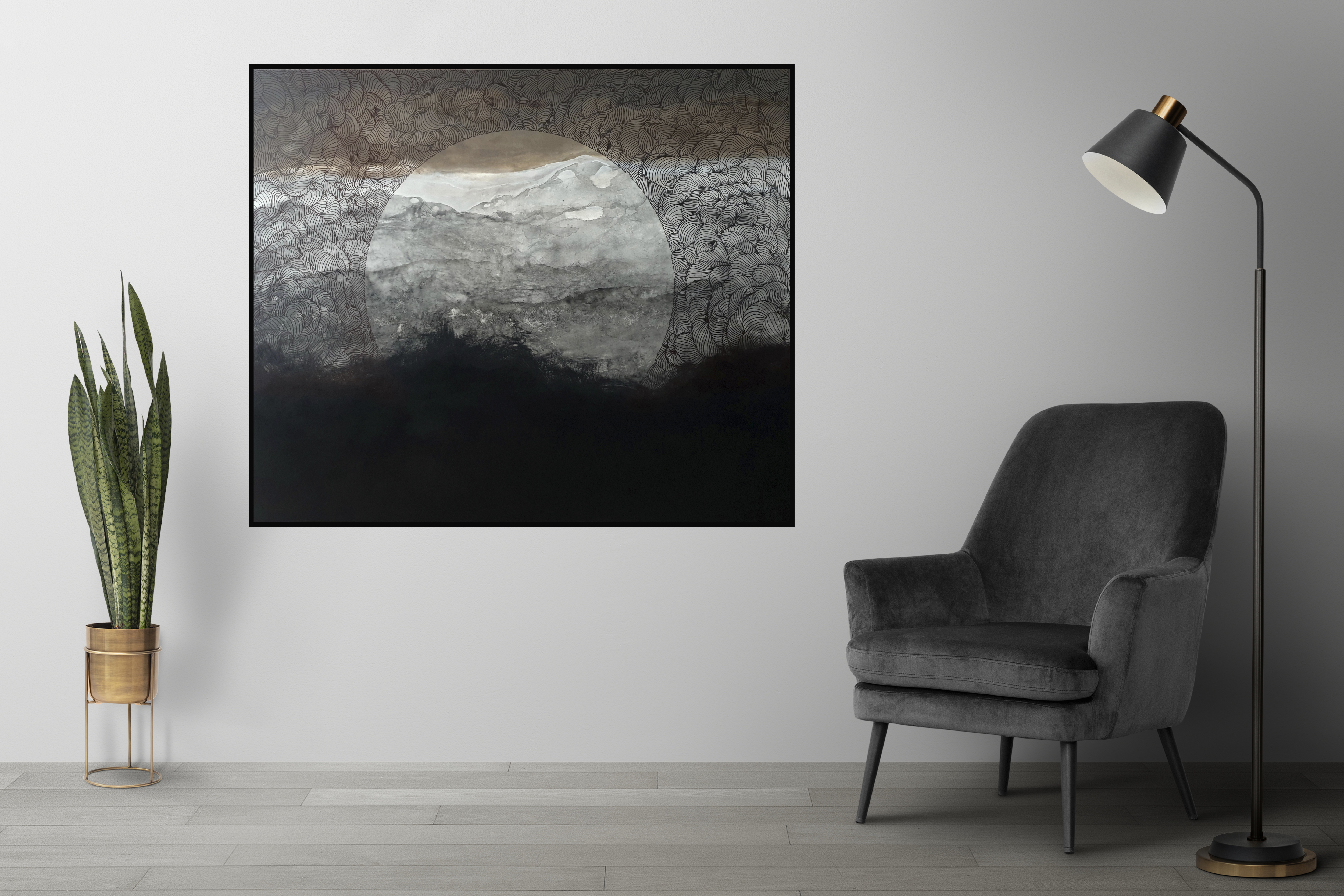 Obraz, który widzimy, to prawdziwa eksplozja wyobraźni. W centrum dominuje ogromne koło, które przypomina księżyc lub magiczny portal. Otacza go misternie narysowana plecionka przypominająca fale; ich łagodne linie falują jak morskie zaspy. Kolory to stonowane odcienie szarości, z subtelnym akcentem brązu, które tworzą nostalgiczną i zagadkową atmosferę. A nad wszystkim unosi się aura pewnej tajemniczości – jakbyśmy patrzyli na nieodkryty świat. Styl dzieła jest mieszanką abstraktu i surrealizmu. Artysta z niezwykłą precyzją połączył różne techniki: od delikatnego rysunku po rozwodnione farby, które płyną i mieszają się, tworząc nieuchwytne kształty. Jest tu coś z dreamscape'u – wyraziste obrazy połączone z nieco mglistym tłem. Obraz może wywoływać wiele emocji. Jedni mogą poczuć spokój i harmonię, inni przytłaczający niepokój. Ale wiesz co? To jak podróż do świata snów. To dzieło jest jak magiczna brama, która prowadzi do innego wymiaru. "Wow, wygląda jak księżyc!", powiedziało by pewnie 7-letnie dziecko. Z kolei dorosły widzi w tym odniesienie do wiecznej walki jasności z ciemnością. Ten obraz jest tak captivating, że nie sposób przejść obok obojętnie. A czy ty też czujesz ten niepokój, patrząc na te mgły, które mogą skrywać wszystko i nic?