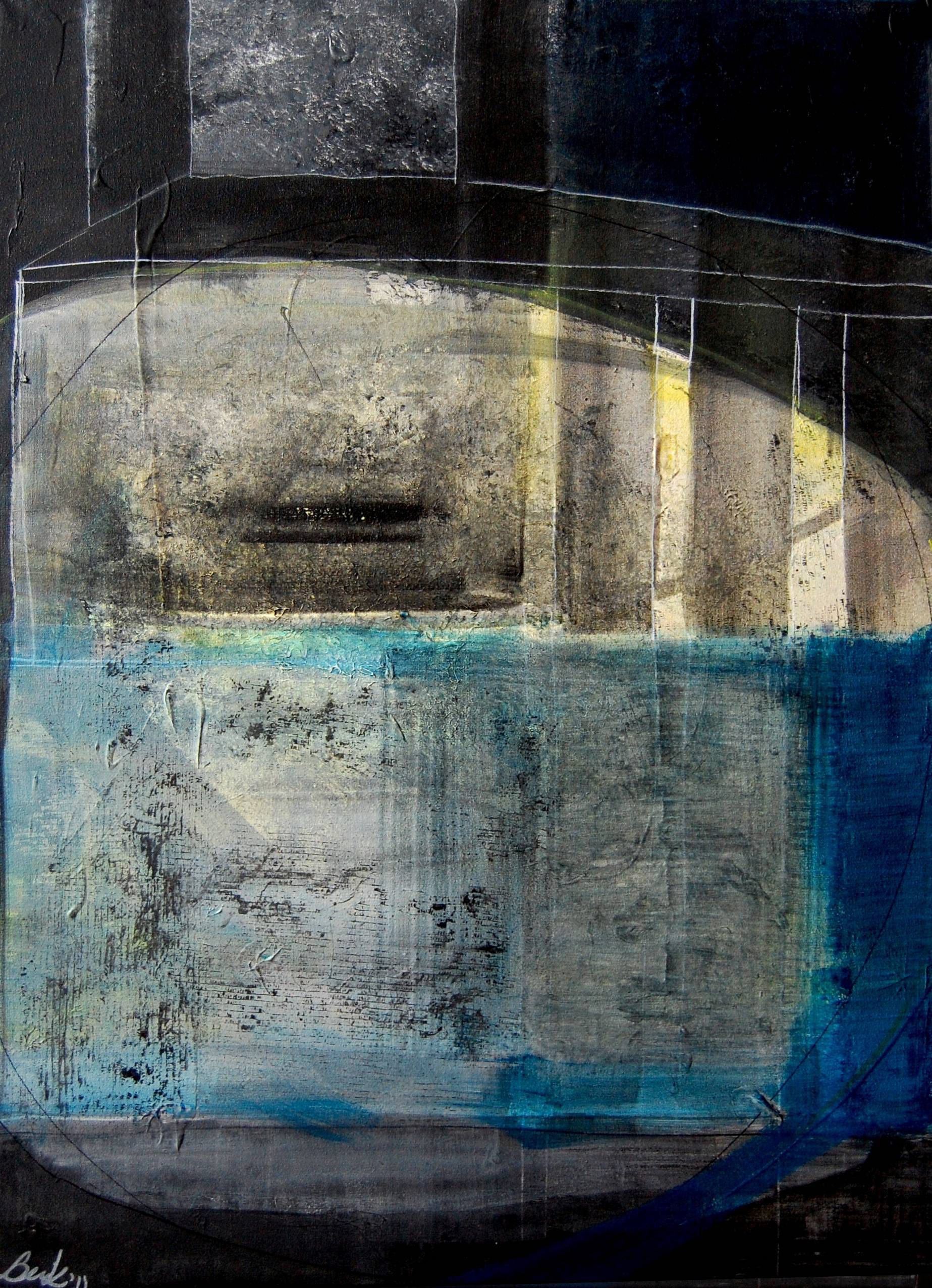 Kompozycja łącząca plamę malarską z graficzną kreską. Pierwszy plan zdominowany jest przez obłą formę , delikatną w swej strukturze, drugi plan budują geometryczne formy nadając głębię płaszczyźnie malarskiej.