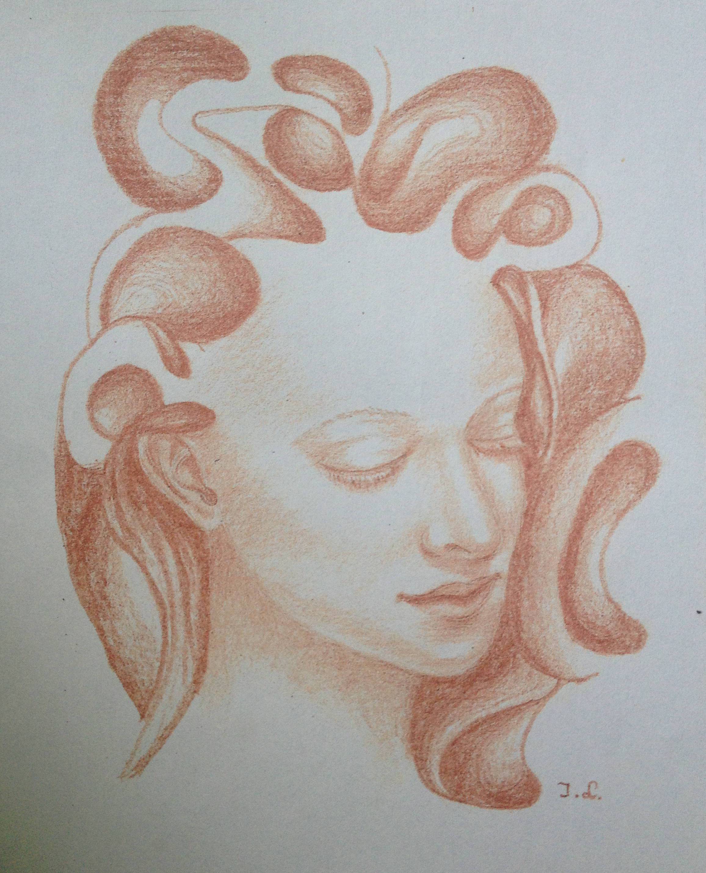 Na obrazie widzimy subtelną, delikatnie szkicowaną twarz kobiety z zamkniętymi oczami. Tło jest jasne, co nadaje kompozycji uczucia lekkości. Kolory to głównie odcienie sepii, a kontury miękko wtapiają się w tło, tworząc harmonijną całość. Rysunek jest pełen lekkości i finezji. Włosy kobiety układają się w eleganckie, giętkie formy przypominające fale, które zdają się niemal tańczyć wokół jej głowy. Atmosfera obrazu to cisza i spokój. Wyraz twarzy kobiety emanuje wewnętrznym spokojem. Styl artystyczny łączy klasyczną elegancję z nowoczesnym minimalizmem, co sprawia, że praca jest timeless. Rysunek ołówkiem wynosi delikatne cieniowanie, które dodaje głębi i trójwymiarowości. Dzieło wywołuje u mnie uczucie zafascynowania i zadumy. To jak sen, w którym zanurzamy się w wewnętrzny świat i zapominamy o rzeczywistości. Może sprawiać, że odbiorca poczuje się uspokojony. Rysowanie tak subtelnych detali wymaga niesamowitej precyzji. To jak cicho szepczące opowieści snute przez artystę. Myślę sobie: "To taki piękny obraz, jakby ktoś go namalował specjalnie, żeby mnie zaczarować".