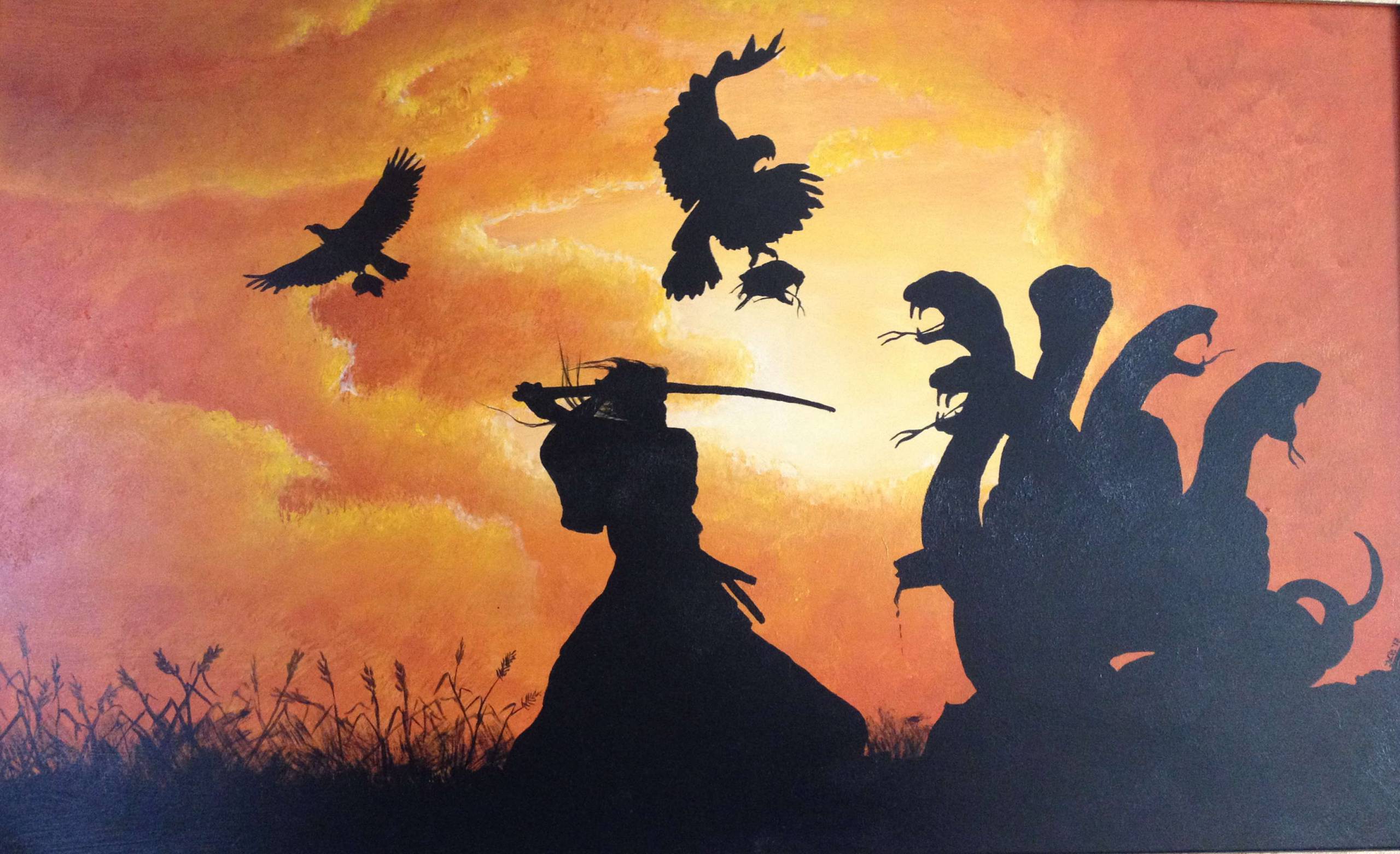 Na obrazie dominują ciepłe odcienie pomarańczy i żółci, które tworzą dynamiczne tło zachodzącego słońca. Silny kontrast stanowią czarne sylwetki - wojownika z mieczem po lewej stronie i majestatycznego węża o wielu głowach po prawej. Kompozycja przyciąga wzrok, osadzając dramatyczną scenę na tle tajemniczego krajobrazu. Atmosfera jest pełna napięcia i tajemnicy, jakby zaklęta w mrocznej bajce. Styl artysty łączy prostotę z wyrazistością poprzez wykorzystanie silnych, graficznych konturów i intensywnych kolorów. Obraz emanuje sensem walki i odwagi. Może wywoływać uczucie podziwu i wewnętrznej mobilizacji. "Battle" - to jedno słowo przychodzi na myśl patrząc. Technika kontrastu i symbolizmu nadaje dziełu dynamiczny i jednocześnie nieco mistyczny charakter. Wygląda jakby za chwilę miało się coś wydarzyć. Mały chłopiec mógłby powiedzieć: "Samuraj walczy ze smokiem!" I faktycznie, obraz przemawia do nas tą prostotą dziecka, ukazując odwieczną walkę dobra ze złem. Uchwycenie tego momentu powoduje, że czujemy się jakbyśmy stali u boku wojownika, gotowi do wspólnej przygody.