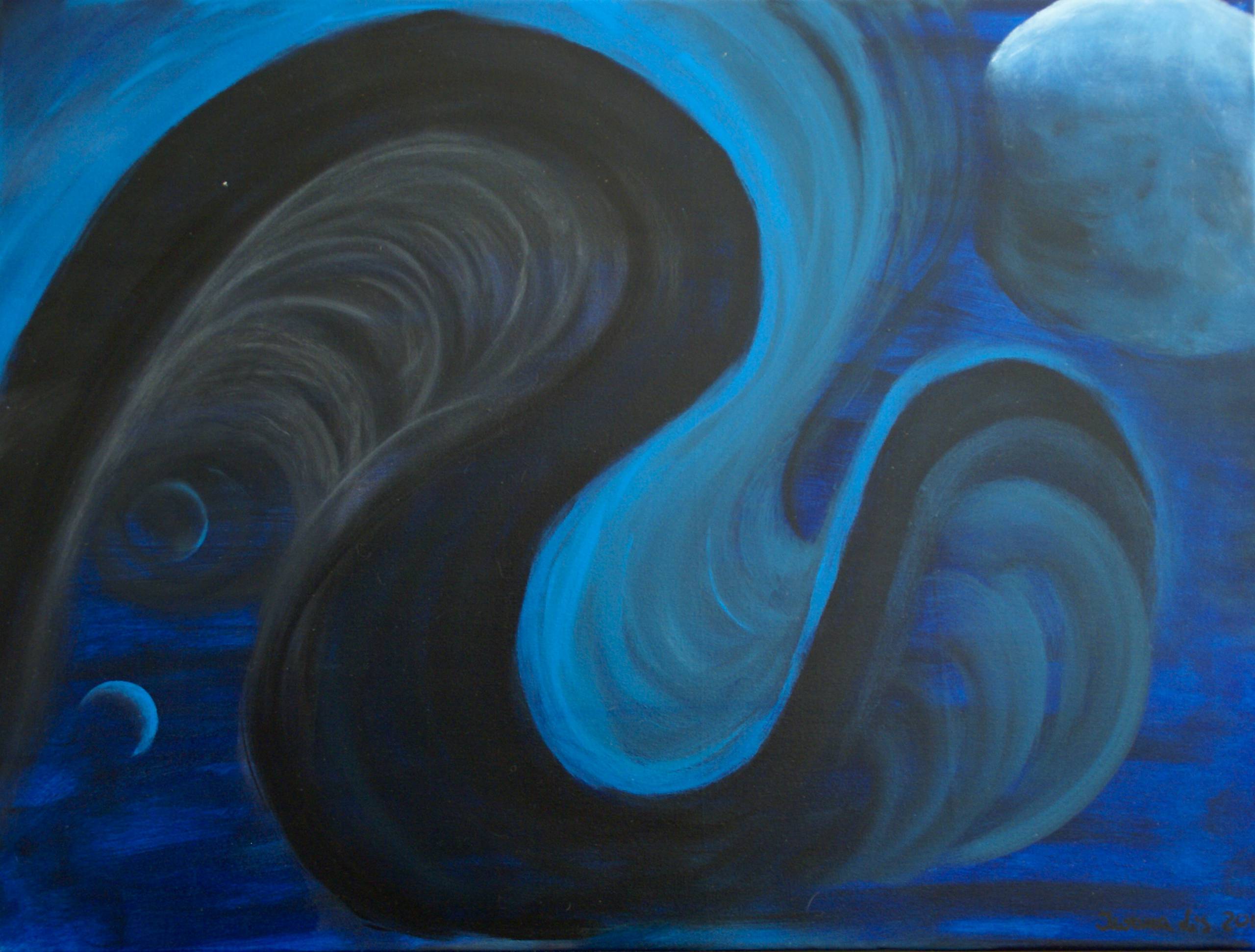 Obraz prezentuje tajemniczą mieszankę wirujących kształtów, dominują tu odcienie niebieskiego i czerni. Te kolory tworzą dynamiczną kompozycję, która przywodzi na myśl kosmiczny taniec. Ruchome linie wirują, jakby próbując uchwycić nieskończoność nocy. Atmosfera jest spokojna, a jednocześnie pełna niepewności - może to cisza przed burzą? Styl obrazu przypomina nieco abstrakcyjne dzieła impresjonistów, z miażdżącą ilością emocji i nieuchwytnym urokiem. Czuć w nim coś magicznego, jakby chciał coś opowiedzieć, ale bez słów. Może to tajemnica kosmosu? Dla mnie to trochę jak patrzenie na nocne niebo i marzenie o podróży międzygwiezdnej. Te kształty, które mogą przypominać planety albo fale, wciągają widza w niekończącą się opowieść - "WOW, to wygląda jak fale na morzu!" jak powiedziałby 7-letni odkrywca w Tobie. Obraz wzbudza refleksje o nieskończoności i ciszy wszechświata, jest w tym wszystkim pewien "mystery", który sprawia, że trudno odwrócić wzrok.