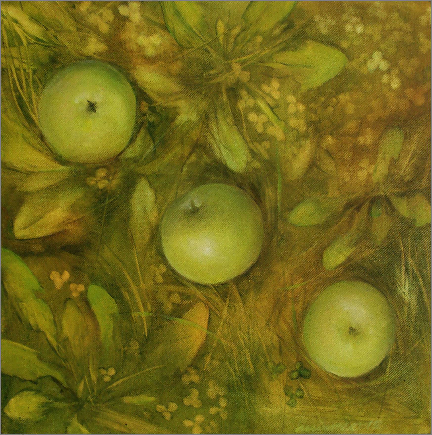Na obrazie widzimy trzy soczyste, zielone jabłka zatopione w bujnej, równie zielonej scenerii. Całość jest utrzymana w głębokich odcieniach zieleni, co nadaje kompozycji harmonijny i uspokajający charakter. Artysta zastosował delikatne pociągnięcia pędzla, które tworzą miękkie przejścia między kolorami, niemal jakby jabłka i liście były częścią tego samego, żywego organizmu. Tło składa się z rozmytych liści i subtelnych kwiatów, co sprawia, że całość nabiera niemal magicznego, dziś powiedzielibyśmy: dreamlike, klimatu. Obraz emanuje spokojem i zenowym wręcz nastrojem. Styl malarski jest realistyczny, jednak z nutą impresjonizmu, którą dodaje lekkie rozmycie i sposób, w jaki kolory się przenikają. Pomimo tej harmonijnej kompozycji, każdy, kto spojrzy na obraz, może poczuć nutkę nostalgii za dzieciństwem, gdy biegało się po sadzie. "Mamo, chcę jabłko!" powiedziałoby dziecko, zapatrzone w tę scenę. Jabłka zdają się niemalże wyciągać rękę do widza, zachęcając do zanurzenia się w ich towarzystwie. Emanuje z tego obrazu ciepło i serdeczność, które otulają serce widza niczym miękki koc w chłodny dzień.