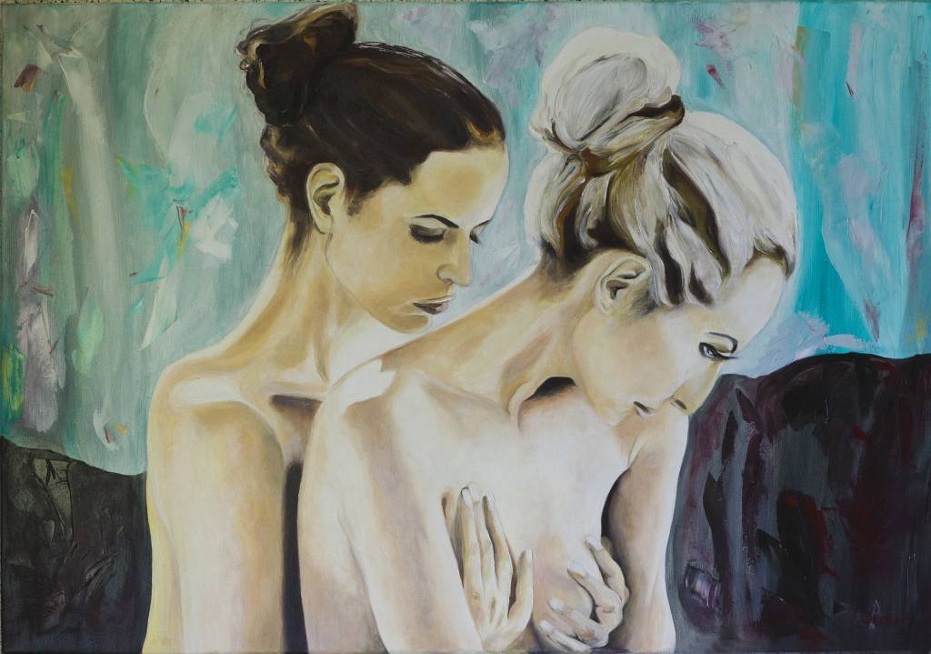 Na obrazie widać dwie kobiety, które są blisko siebie, zupełnie jakby były jedną istotą. Tło w odcieniach turkusu i fioletu zdaje się okrywać postaci tajemniczą mgłą, na przemian chłodną i ciepłą. Obie kobiety mają włosy upięte w kok. Kolory są stonowane, ale jednocześnie kontrastujące. Ten kontrast wzmacnia emocje, które biją z obrazu. Styl, w jaki artysta użył pędzla, jest bardzo subtelny – możemy dostrzec delikatne pociągnięcia, które tworzą wrażenie miękkości. Atmosfera obrazu jest pełna spokoju i intymności. Czujemy, że między tymi dwiema kobietami jest coś niezwykłego i trudnego do opisania. Może to przyjaźń, może coś więcej. Takie "silent connection". Artystyczne techniki mieszają realizm z delikatną abstrakcją, co dodaje dziełu niezwykłej głębi. Emocje bijące od postaci są subtelne, ale wyczuwalne. Można poczuć melancholię i ciepło zarazem. Obraz wywołuje refleksję na temat relacji międzyludzkich. Sprawia, że zastanawiamy się nad bliskością, jaką tworzymy z innymi i jak jest ona ważna w naszym życiu. Tło, choć abstrakcyjne, harmonijnie łączy się z postaciami, tworząc jedność. "Super!" powiedziałoby dziecko, patrząc na kolory. Te myśli i emocje, które obraz przynosi, pozostają na długo w pamięci.