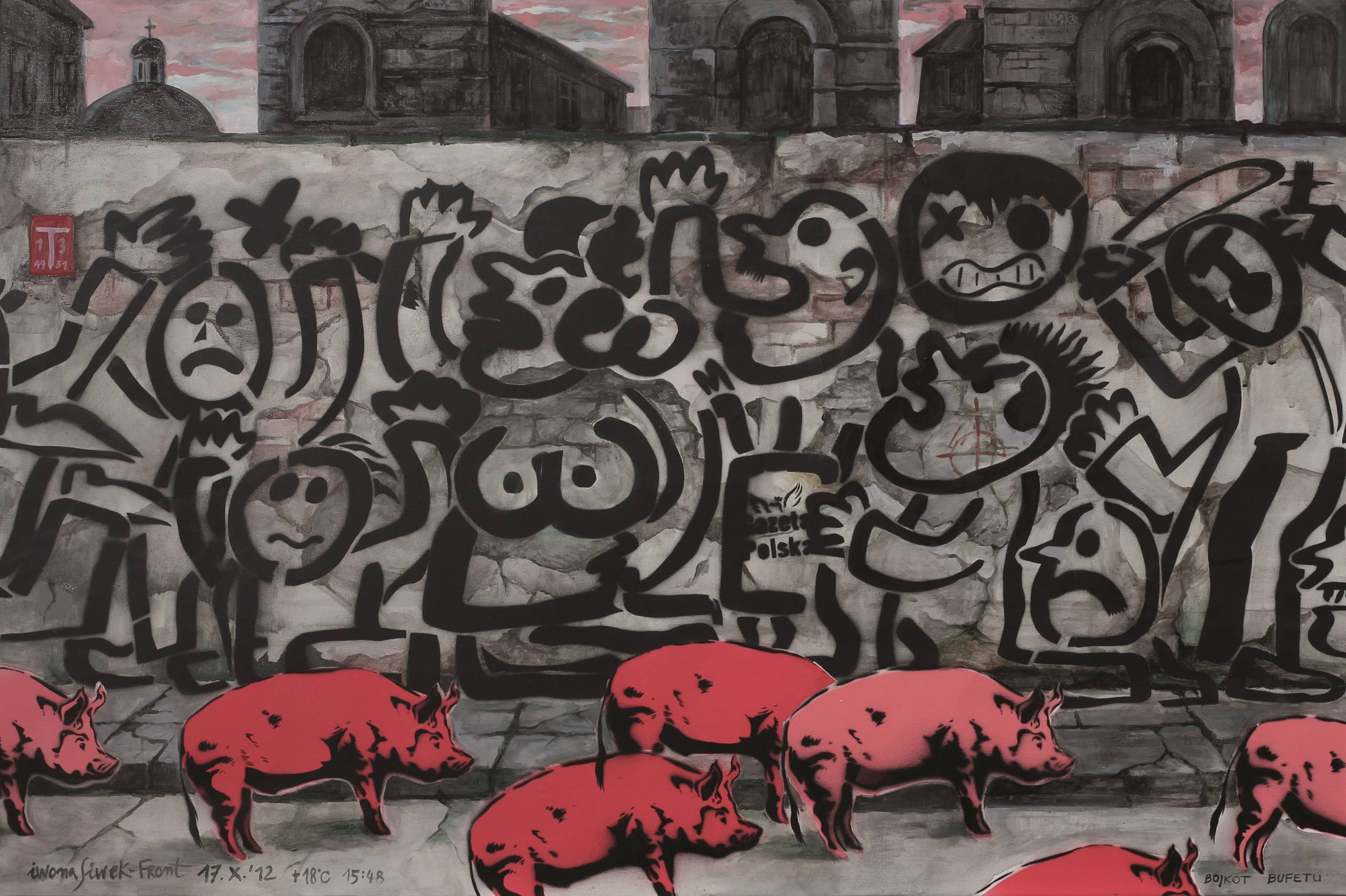 rok 2012 A, tak, bo mur... To mur jest we współczesnym mieście ważnym nośnikiem informacji i granicą między tym, jak ma być a jak jest. Taki mur na Bożego Ciała! Odgradzający areał kościoła Bożego Ciała od ulicy, stanowiący granicę między sacrum i profanum. Z tamtej strony modły i zapach kadzidła, i tak od średniowiecza, z tej, krakowski Kazimierz z jego długą historią przedwojenną, wojenną tragedią, powojennym wyludnieniem i aktualnym renesansem. Kościół trwa, mur żyje i zmienia się razem z miastem. Na murze mamy wszystko. Sztukę i bohomazy, hasła z lewa i prawa, codzienny vox populi i wyznania miłosne, CHWDP i krucyfiksy...(...) [fragm.tekstu Elżbieta Binswanger-Stefańska]
