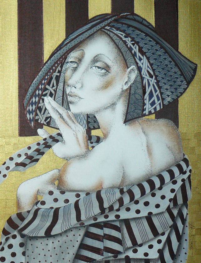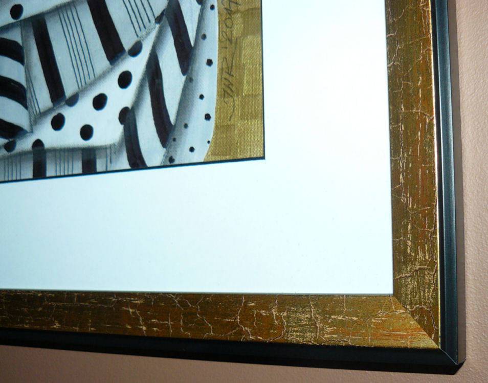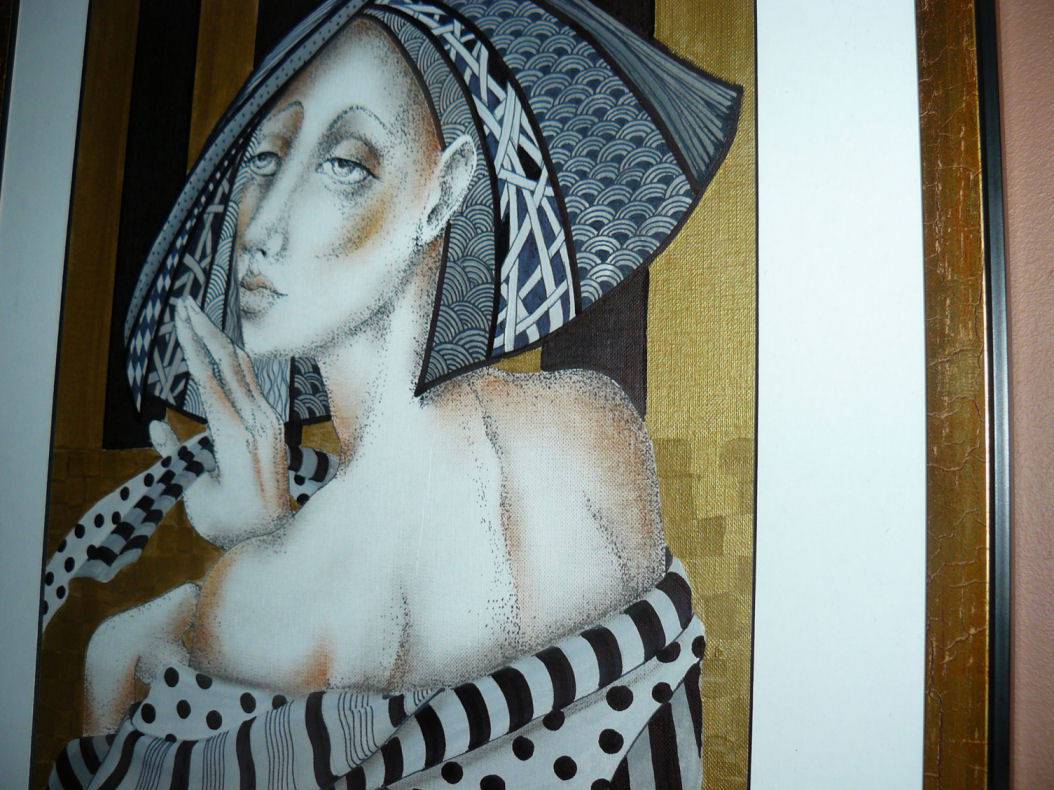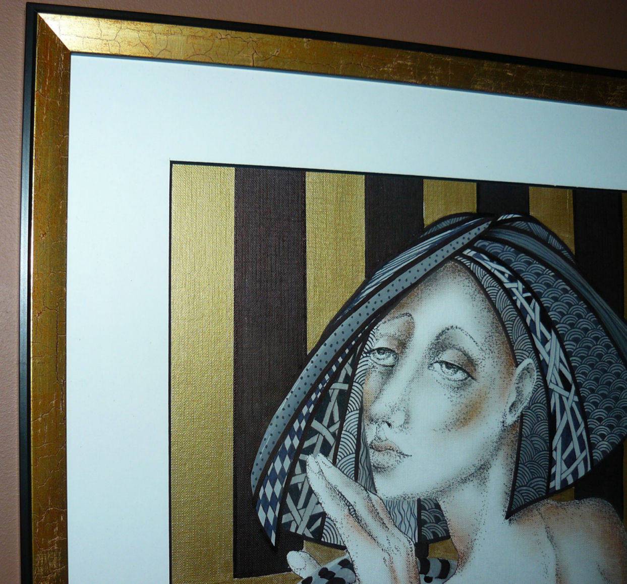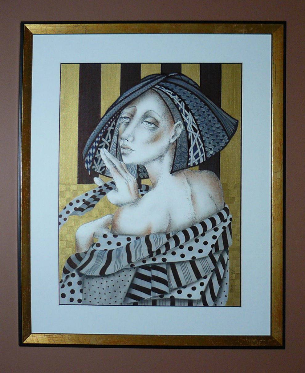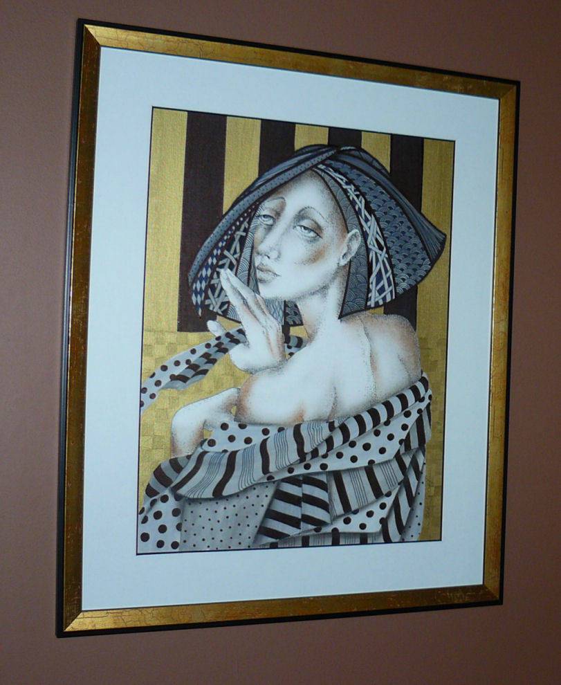 echnika mieszana (gwasz, sangwina, cienkopisy) na papierze Fabriano 300 g/m2, Obraz oprawiony jest w białe passepartout z czarnym rdzeniem oraz bardzo elegancką ramę w kolorze czarno złotym ze szkłem. Rozmiar całosci: 43,5 x 53,5 cm. Obraz sygnowany inicjałami autorki. Do pracy załączam certyfikat autentyczności