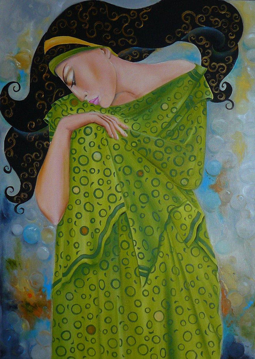 Obraz wykonany techniką olejną na płótnie. Posiada zamalowane boki, sygnowany na odwrocie imieniem i nazwiskiem autorki.