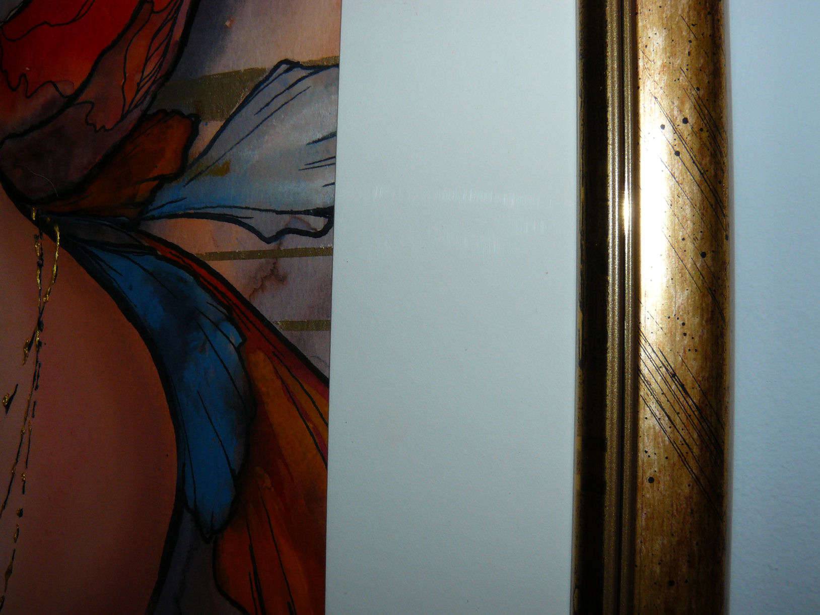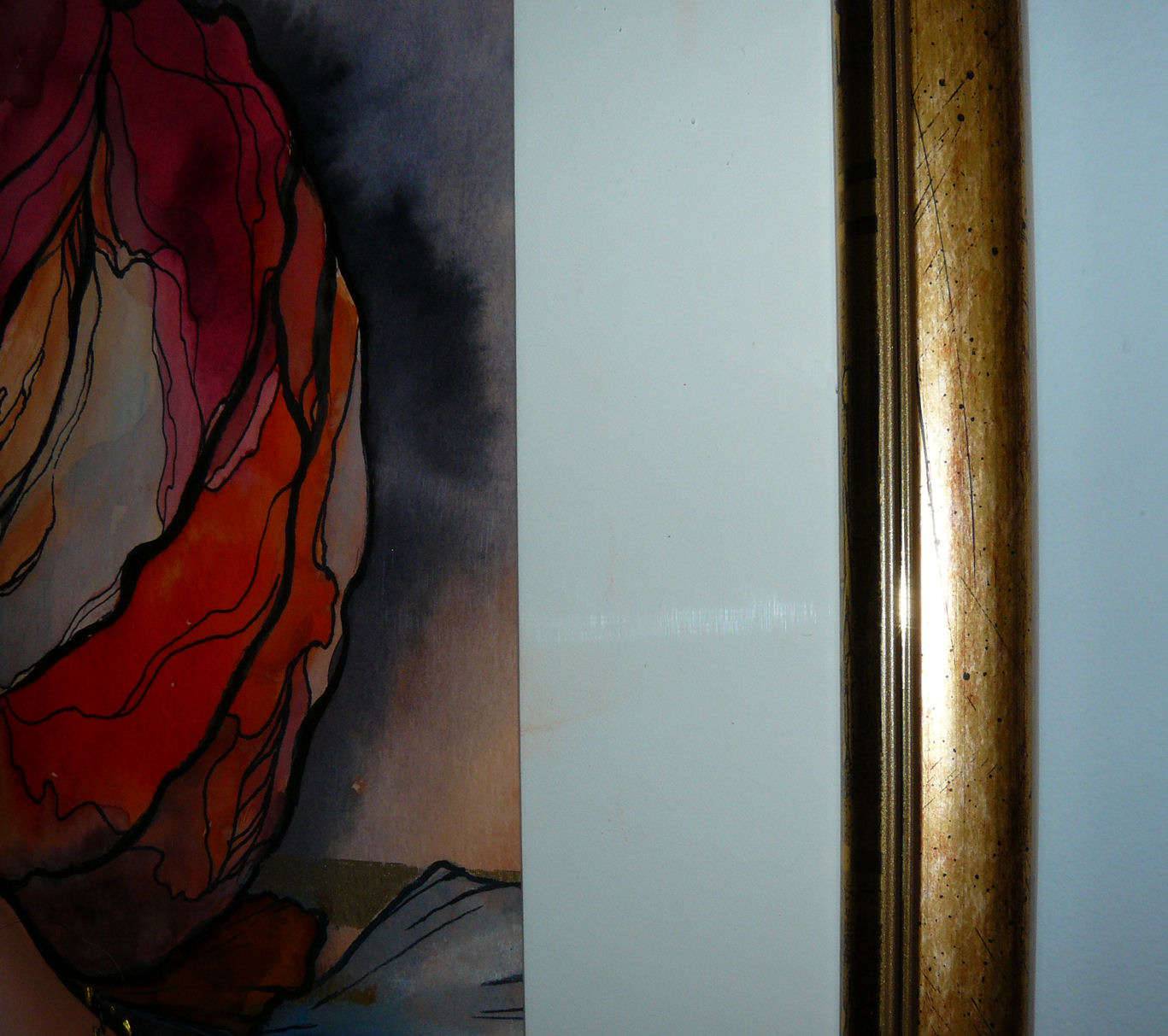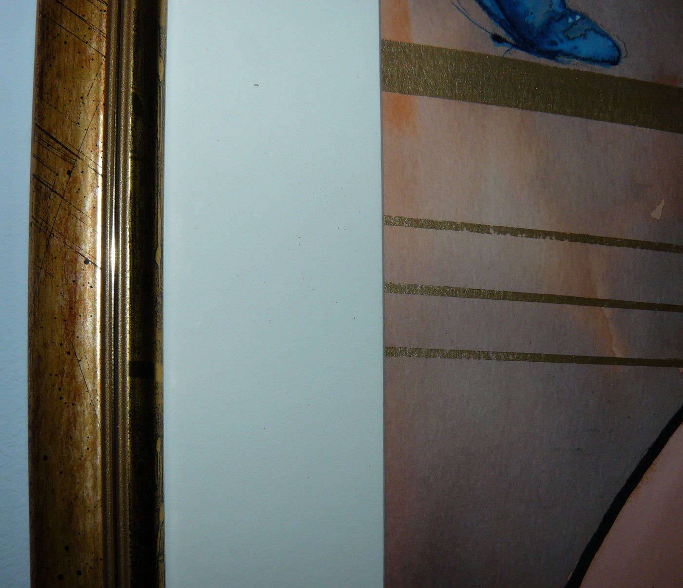 Obraz wykonany techniką mieszaną: akwarela,pastele, tusz na papierze akwarelowym 300 g/m2 Obraz oprawiony w białe passepartout oraz złota ramę .