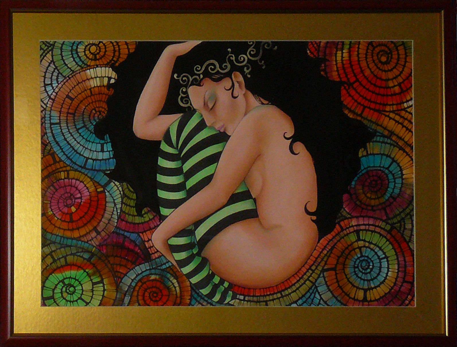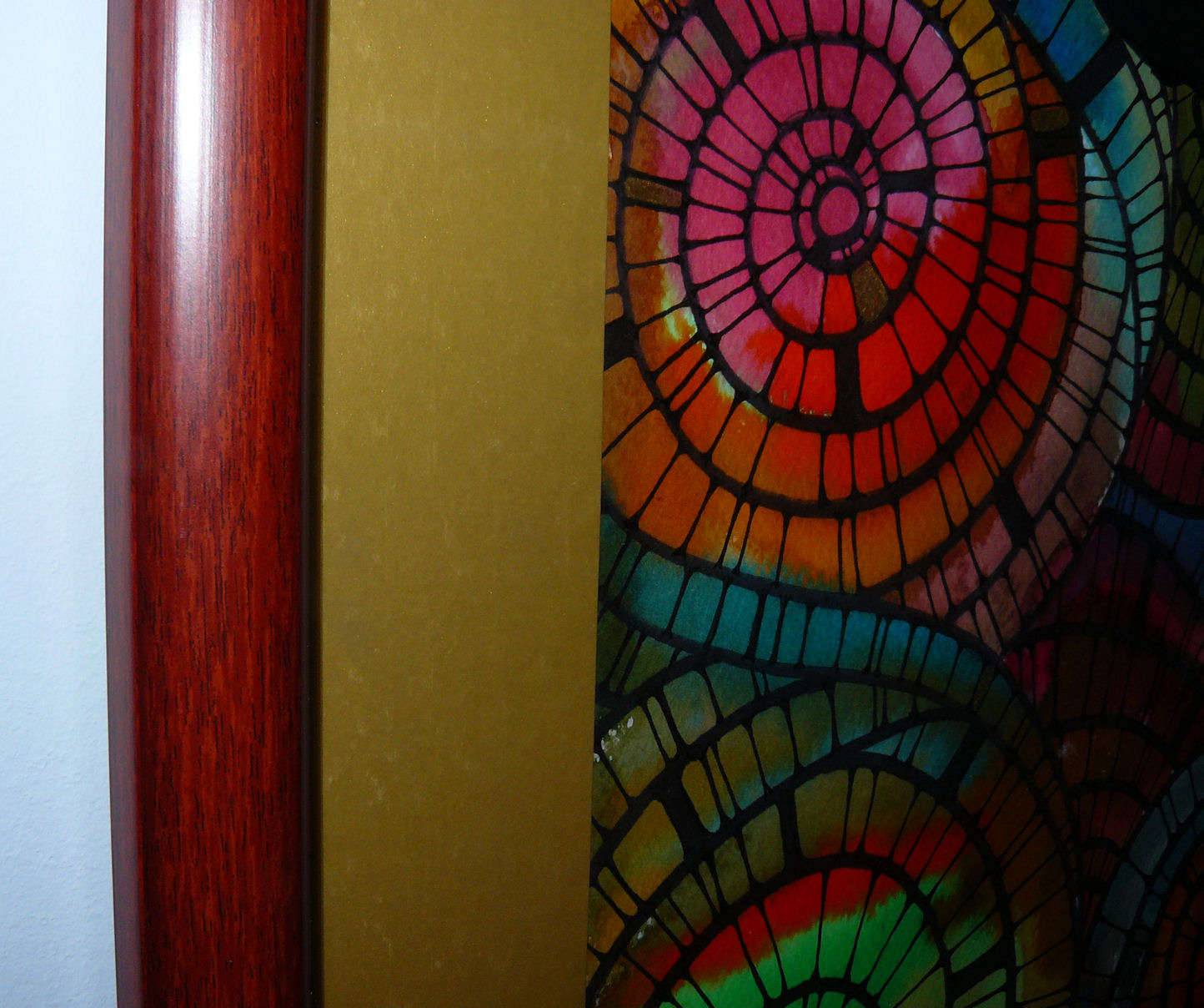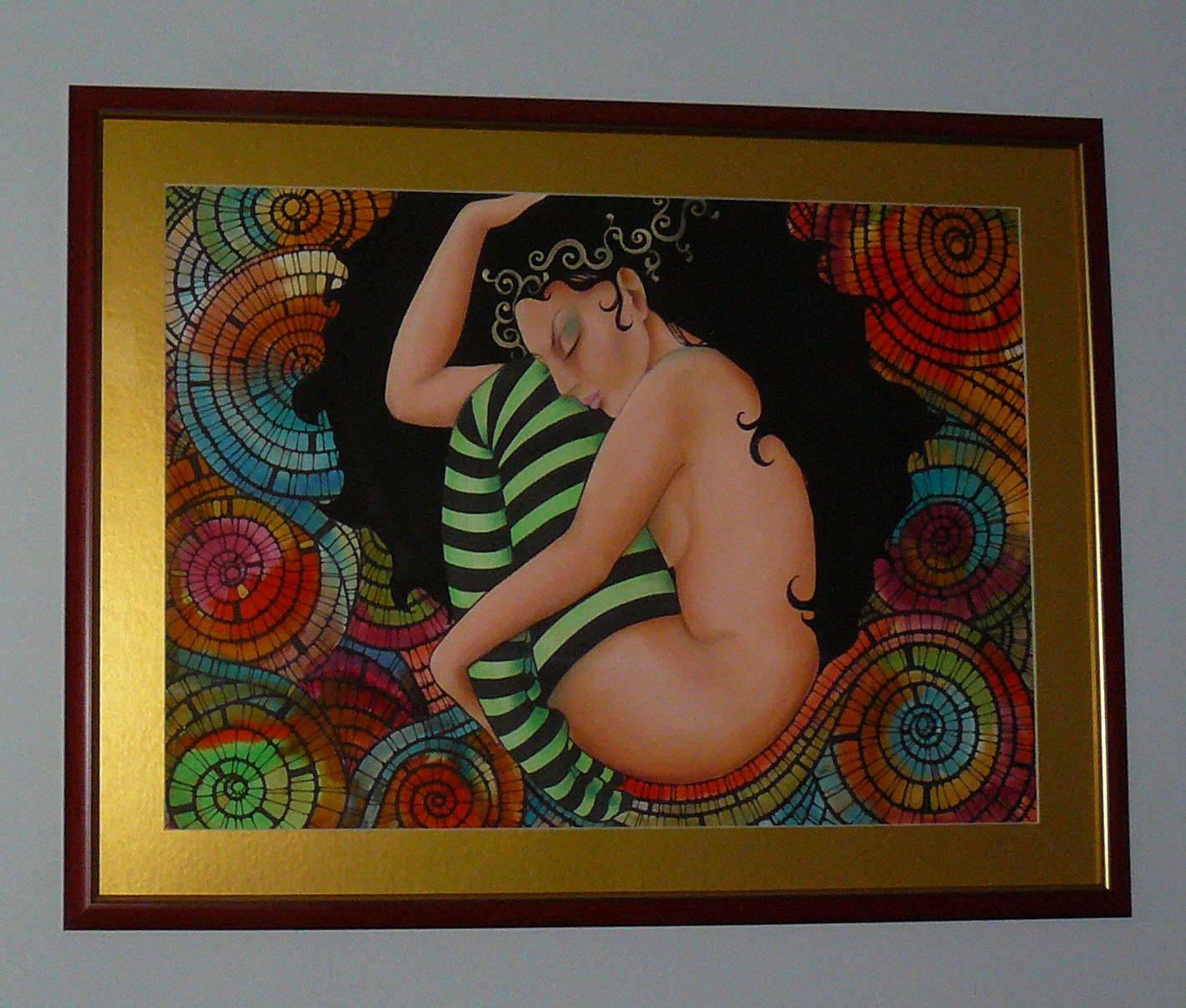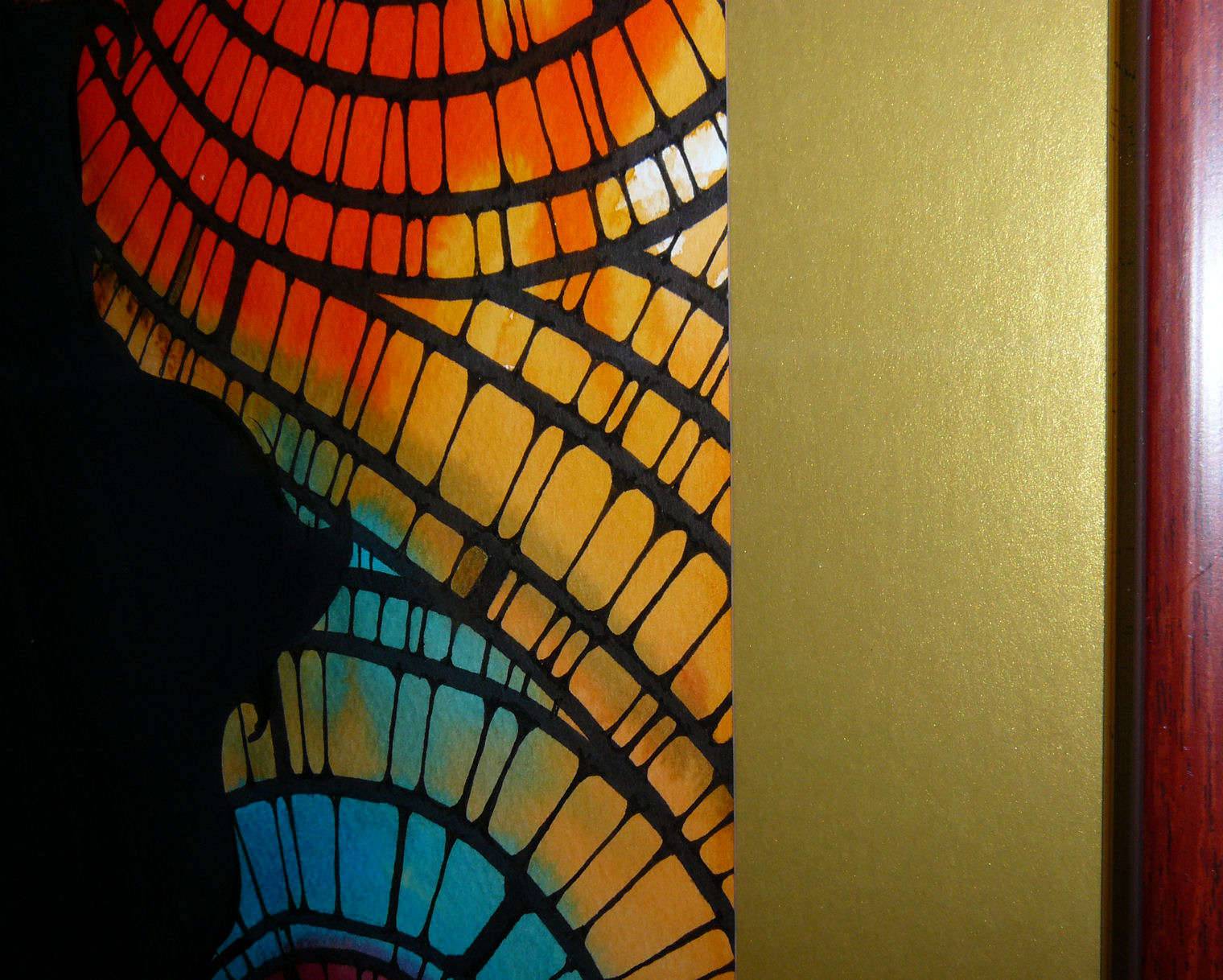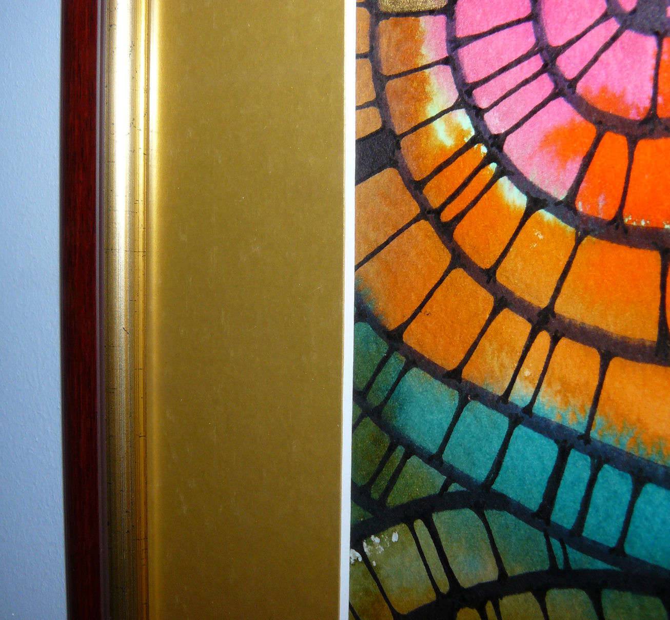 Technika mieszana na papierze akwarelowym 300 g/m2, Obraz oprawiony w złote passepartou oraz ramę w kolorze mahoniowym ze złotym paskiem..