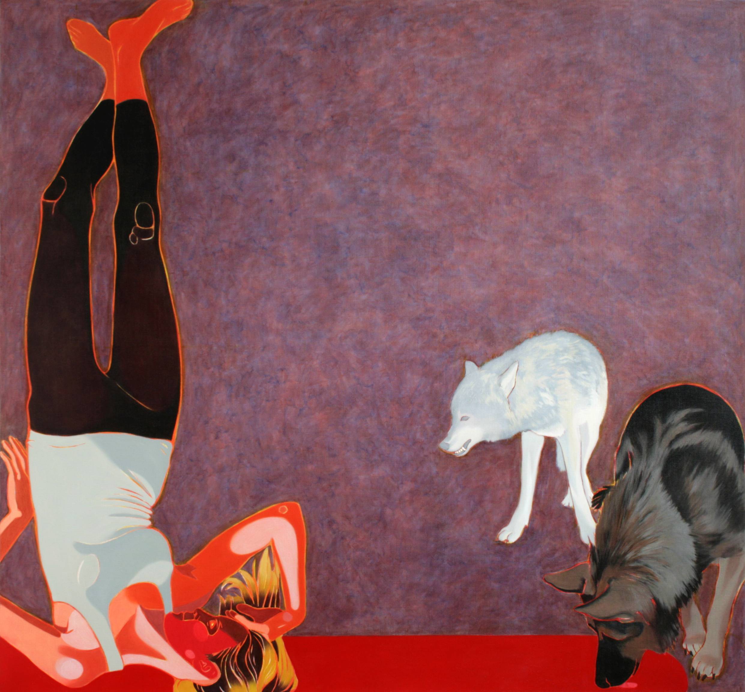 Na obrazie widzimy interesującą kompozycję, w której dominują ciepłe barwy i kontrasty. Na pierwszym planie postać ludzka z uniesionymi nogami ku górze, ubrana w czarną odzież, a jej skóra emanuje ciepłymi, czerwonymi odcieniami. Kompozycja przyciąga wzrok swoją nietypowością; balansuje na granicy surrealizmu, tworząc pewną nierealistyczną aurę. W tle widzimy dwa psy: biały, niemal eteryczny, zdający się płynąć w przestrzeni, oraz ciemniejszy, stojący pewnie na ziemi. Obraz emanuje spokojem z nutą niepokoju, jakby zatrzymany w kadrze moment, w którym coś się wydarzy. Styl artystyczny jest prosty, ale wyrafinowany. Użycie płaskich, jednolitych kolorów wzmaga dramatyzm sceny, a ostre kontury dodają dynamiki. Artysta używa subtelnej gry światła i cienia, to jest po prostu intrygujące. To trochę jak sen, gdzie wszystko jest możliwe. Patrząc na obraz, można poczuć dziwne napięcie, niemal grozę, ale też zaciekawienie. To wizja, która może wywołać uśmiech, ale równie dobrze przerażenie. Ma w sobie coś z magicznej opowieści, a jednocześnie jest very real. Moja interpretacja? To zderzenie z dziką stroną naszego życia, z tym, co nieoczywiste. A jak mówi dziecko: „Fajny obrazek, bo jest śmieszny”. образом.