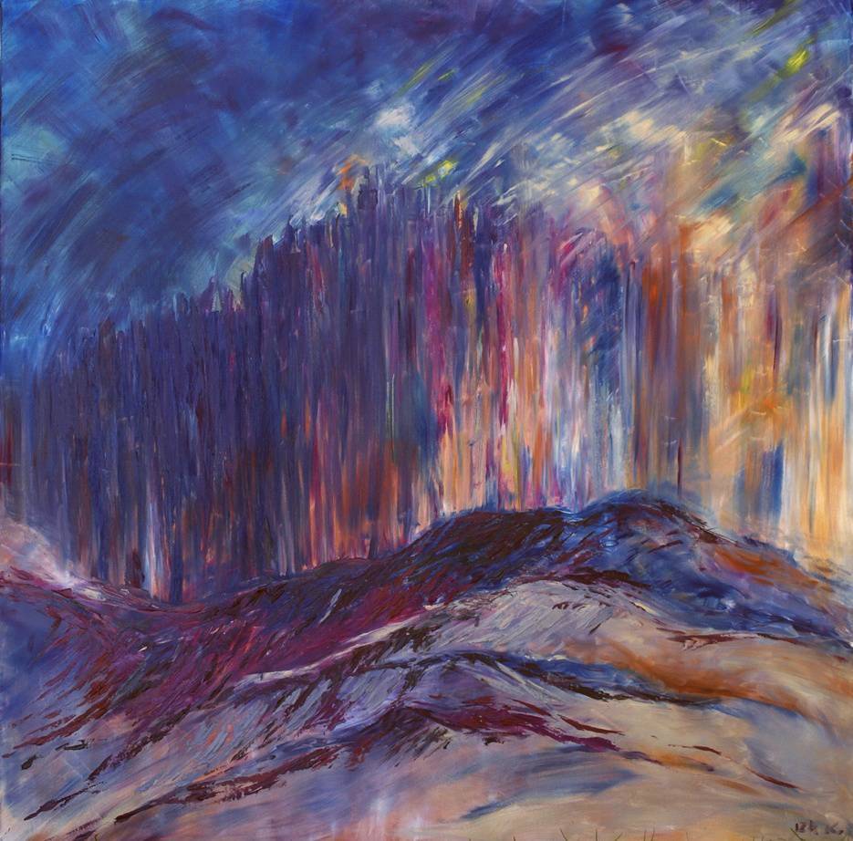 Na tym obrazie dominuje intensywność kolorów. Głęboki błękit nieba miesza się z odcieniami purpury i różu, tworząc dynamiczną, niemalże burzliwą atmosferę. Krajobraz zdaje się być oniryczny; iluzoryczne wzgórza przypominają niemal falujące morze. Kompozycja obrazu jest pełna ruchu, co nadaje mu żywą energię. Artysta użył techniki impastu, by podkreślić emocjonalną głębię dzieła. Pociągnięcia pędzla są wyraziste, jakby malarz chciał uchwycić moment pełen dramatyzmu. Obraz może przywoływać uczucia melancholii, a nawet niepokoju u niektórych widzów, lecz równocześnie jest pełen fascynacji i tajemnicy. Przypomina mi trochę scenę z ulubionej bajki, jak gdyby natura przejęła kontrolę nad płótnem. Coś w tym jest takiego, że widzisz to i myślisz: "Wow, incredible!" Czujesz, jakbyś wnikał w głąb tego niezwykłego świata, stając się częścią niespokojnej sceny. Ta mieszanka kolorów, skąpana w świetle, tworzy nie tylko obraz, lecz także emocję, która zostaje z tobą, przemyka przez myśli i serce. Ciekawe, czy artysta był w nastroju burzliwym, malując to dzieło czy to raczej wizja spokojnej refleksji? Nie wiem, ale czuję, że to coś więcej niż tylko obraz.