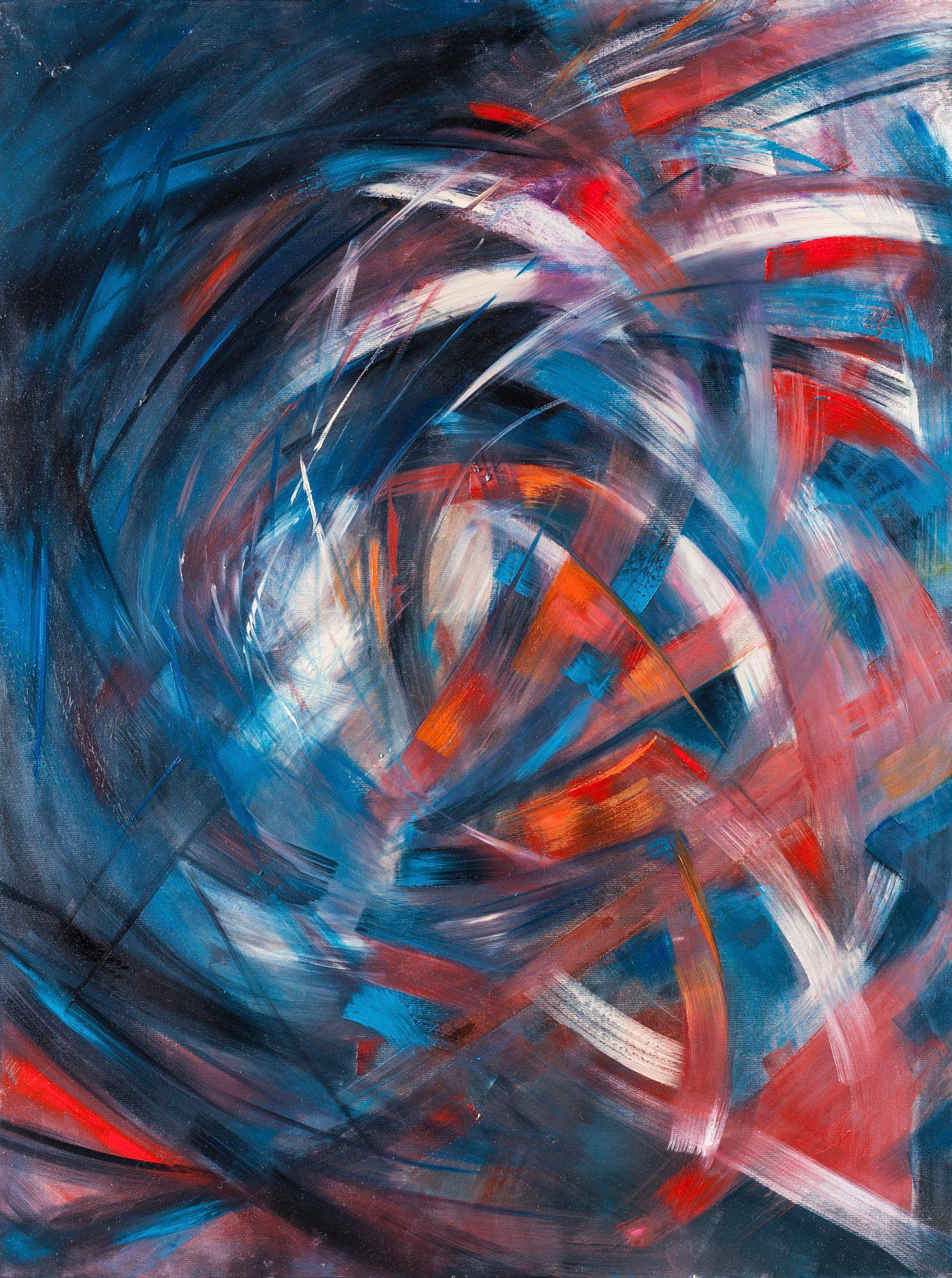 Ten obraz to zawrót głowy emocji, który wiruje i tańczy na płótnie. Kolory, głównie intensywne błękity, czerwienie i biele, tworzą dynamiczne, krzyżujące się linie, które przyciągają wzrok niczym tornado chaosu. Całość przypomina abstrakcyjny wir, gdzie każda barwa walczy o swoją przestrzeń. Atmosfera jest niezwykle energetyczna i burzliwa, jakby artysta chciał oddać moment kulminacyjny żywiołu. Styl obrazu to klasyczna abstrakcja. Widać tu zdecydowane pociągnięcia pędzla, które są jednocześnie pełne pasji jak i precyzyjnej kontroli. Techniki zastosowane przez artystę to śmiałe, szerokie ruchy, które dodają dynamiki i głębi kompozycji. Czuję, że to artwork odzwierciedla wewnętrzne zmagania i napięcia. Odbiorca może poczuć zarówno ekscytację, jak i niepokój, zastanawiając się, co kryje się w tym kalejdoskopie barw. Czy to gniew? A może szczęście? Myślę sobie, że to prawdziwy wyścig emocji. Ciekawe, jakie historie kryją się w tych kolorach. Ja bym powiedział, że to sztuka pełna życia i spontaniczności. Dla dziecka to pewnie wygląda jak szalone wyścigi kolorowych samochodów. Obraz przypomina mi trochę ekspresję muzyki, gdzie każda nuta walczy o swoją chwilę blasku, tworząc symfonię dla zmysłów. To taka podróż, która angażuje i nie pozwala na chwilę znudzenia. Fascynujące, jak coś tak abstrakcyjnego może być jednocześnie tak realne i pełne intensywnych emocji.