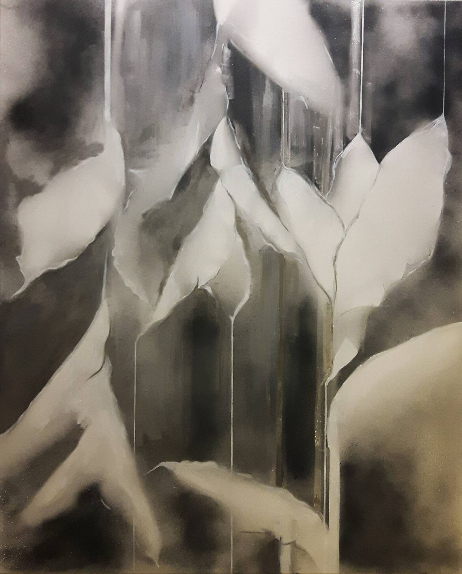 Obraz przyciąga wzrok subtelnością i tajemniczością. Dominują tu delikatne odcienie bieli, szarości i czerni. Kształty przypominają ulotne, eteryczne liście, które unoszą się w tajemniczej przestrzeni. Kompozycja jest jak sen, gdzie rzeczywistość miesza się z fantazją, a granice między nimi są rozmyte. Atmosfera dzieła jest spokojna, niemal medytacyjna. Można poczuć lekką aurę mistycyzmu, jakby obraz był zaproszeniem do refleksji i kontemplacji. Technika, jaką zastosowano, to gra z cieniami i światłem. Delikatne pociągnięcia pędzla tworzą wrażenie „softness”, które działa niczym subtelny dotyka. Obraz przywołuje różne emocje. Może pojawić się nostalgia, a nawet lekkie zagubienie. Czasem myślę, że to przedstawienie wewnętrznego spokoju i chaosu równocześnie. Dzieło może przypomnieć baśniowe krajobrazy z dziecięcej wyobraźni. „To są liście, które spadają z nieba!” – mógłby powiedzieć mały smyk, patrząc na to dzieło. Podziwiam tę zdolność artysty, by uchwycić coś tak ulotnego na płótnie. Gdy patrzę na ten obraz, czuję się jak w magicznym świecie, gdzie wszystko jest możliwe. Coś niesamowitego.