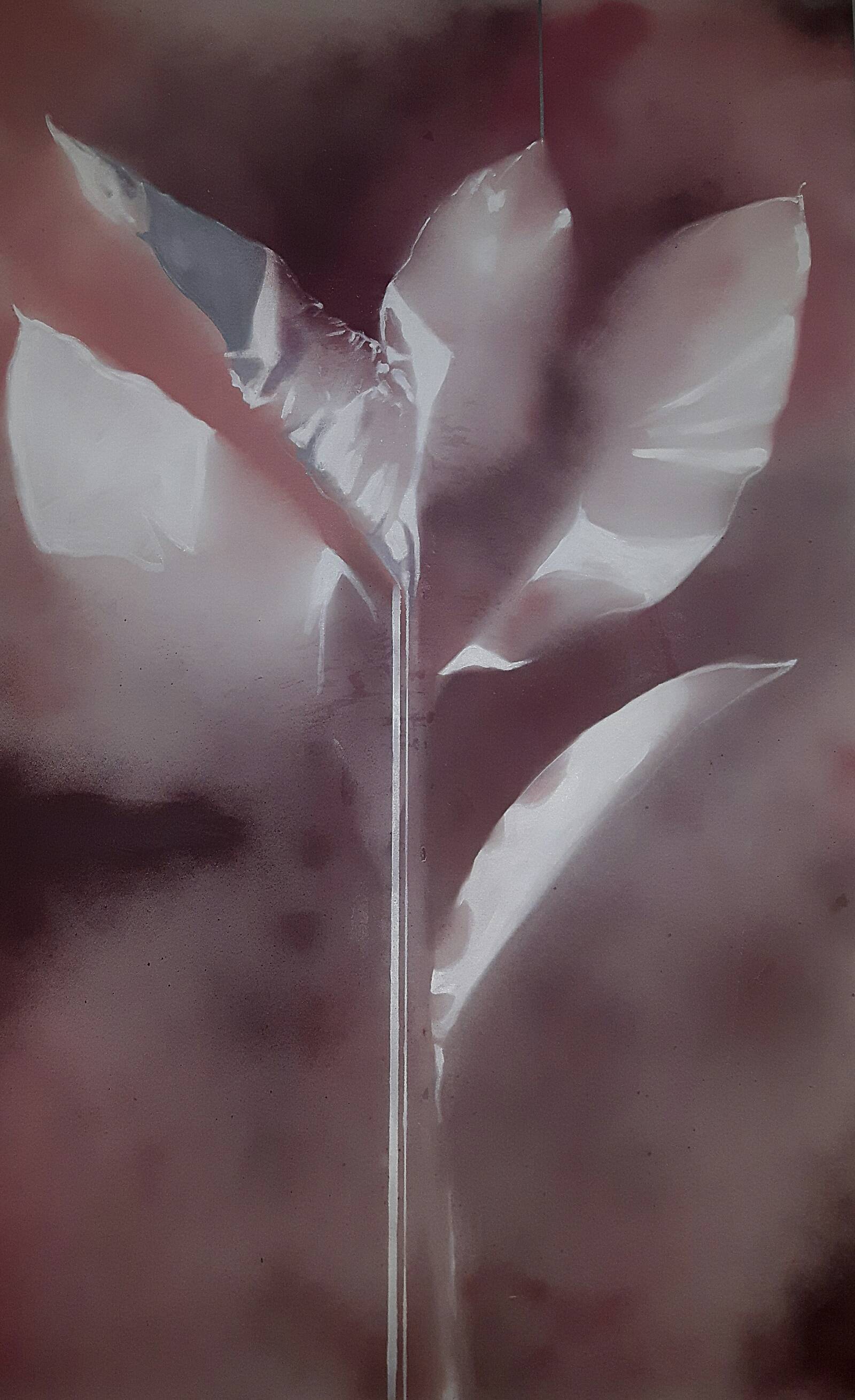 Obraz promieniuje subtelną przytulnością. Dominują w nim pastelowe odcienie różu i brązu, które delikatnie przeplatają się z metalicznym połyskiem. Te różowe maziaje tworzą atmosferę sennego, magicznego świata. Centralny element to liść – jego kształt jest wyraźny, choć nieco zamglony, co dodaje dziełu mistyczności. Artysta zastosował technikę aerografu, co pozwala na płynne przejście kolorów. Dodaje to obrazowi pewnej głębi, delikatnie sugerując ruch. Jest w tym coś dreamlike. Patrząc na ten obraz, można poczuć spokój, może nawet lekki melancholijny nastrój. Dla mnie, jest to jak wspomnienie z dzieciństwa, jakby patrzeć na coś przez mgłę czasu. Ten obraz wygląda jakby liść rósł na szarym niebie! Sposób, w jaki to przedstawiono, jest subtelny, lecz zarazem intrygujący. Jakby każda linia była częścią pamięci, która dopiero co się wyłania. Jego delikatność może wzbudzać emocje – od tęsknoty po czystą akceptację. Może nawet przypominać nam o pięknie w prostocie, o tym, jak naturalny świat jest pełen niezauważonych cudów. Ta gra kolorów i form tworzy coś naprawdę "awesome". Pamiętam, jak jako dziecko marzyłem, żeby mieć taki tajemniczy liść w swoim ogrodzie. Artystyczne pociągnięcia są swobodne, ale zarazem precyzyjne, niczym lekki podmuch wiatru.
