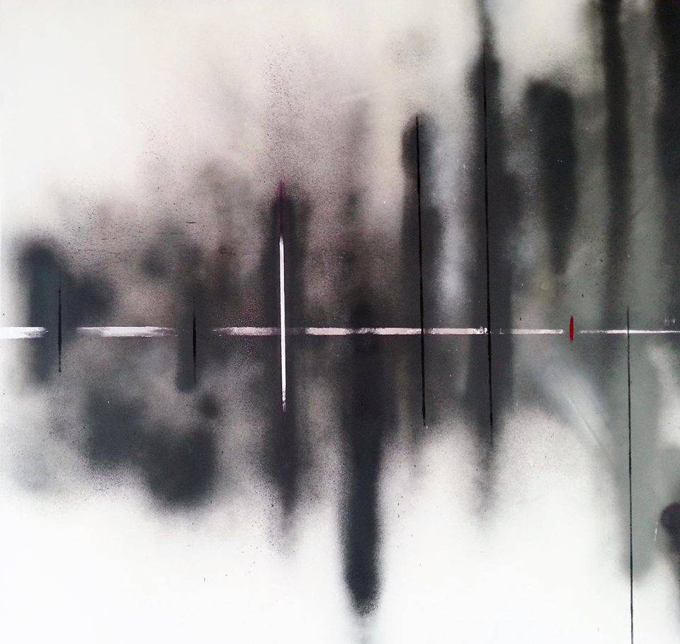Na obrazie dominują stonowane odcienie szarości i bieli z delikatnymi, czarnymi liniami przecinającymi powierzchnię. Widoczne są także subtelne cieniowanie i nieostre kształty, które przypominają smugi dymu lub cienie na ścianie. Kompozycja wydaje się być bardzo minimalistyczna, a jej główną osią jest pozioma linia, przypominająca linię życia z elektrokardiogramu. Jedno malutkie, czerwone pociągnięcie pędzla przyciąga wzrok i przerywa monochromatyczny układ, dodając mu nieco dramatyzmu. Obraz emanuje spokojem, ale też pewnym napięciem. Czuje się w nim atmosferę refleksji, jakby miał zmusić widza do zatrzymania się na chwilę i spojrzenia w głąb siebie. Może to trochę jak cisza przed burzą? Artysta zastosował techniki przypominające spray painting, które dodają dziełu nowoczesnego vibe’u. Prosty styl i oszczędność formy skłaniają do skupienia na detalach i subtelnych różnicach w odcieniach. Patrząc na to dzieło, można poczuć lekkie ukłucie melancholii, ale i nadziei, że każdy ciemny element ma swoje jasne odbicie. To jest dziwny obraz, troszkę jak z kosmosu, powiedziałby mały widz. Moje serce czuje jakieś subtle tension, naturalnie skłania nas do introspekcji. Jakie to jest piękne, jak obrazy mówią różnymi głosami i zmuszają nas do myślenia, prawda?