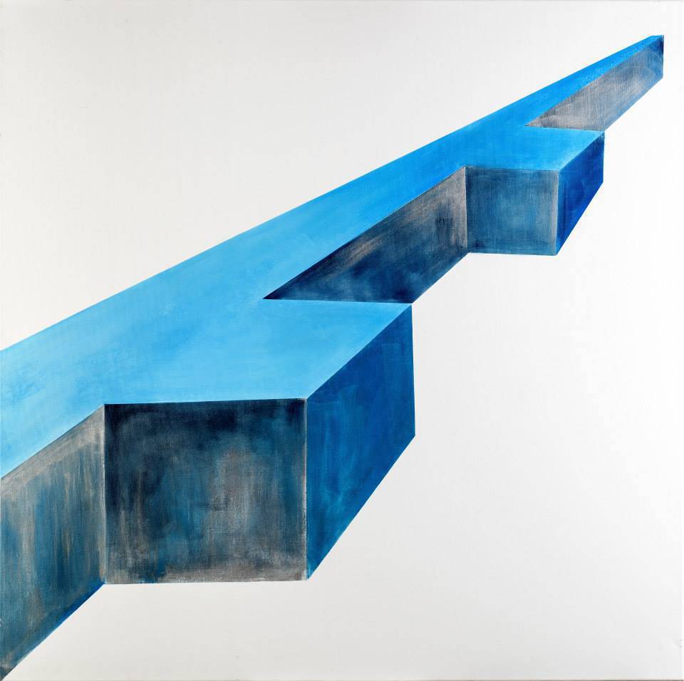 Obraz prezentuje dynamiczną, nieco zagadkową formę w kształcie niebieskiego, przestrzennego obiektu na białym tle. Nasycone odcienie niebieskiego przeplatają się z odrobiną ciemniejszych tonów, tworząc efekt głębi i trójwymiarowości. Te geometryczne kształty, mimo swojej prostoty, są pełne energii i sprawiają wrażenie, jakby były w ruchu. Atmosfera obrazu jest chłodna, lecz jednocześnie intrygująca, przyciąga wzrok i zmusza do zastanowienia. To jest jak science fiction w sztuce – coś z future. Artysta zastosował techniki malarskie, które uwypuklają kontrast pomiędzy formą a tłem, używając płaskich powierzchni i czystych krawędzi. Kompozycja jest minimalistyczna, co nadaje dziełu nowoczesny, futurystyczny styl. Dzieciak powiedziałby: "Fajna kosmiczna droga, co prowadzi do chmur" Obraz może wywoływać emocje związane z odkrywaniem nieznanego, a także poczucie harmonii w geometrii. Na pierwszy rzut oka to tylko kształty, ale im dłużej się przyglądasz, tym więcej tajemnic odkrywasz. Myślę, że to pokazuje nieograniczone możliwości ludzkiego umysłu. Obraz emanuje spokojem, ale jednocześnie prowokuje do refleksji o przyszłości.