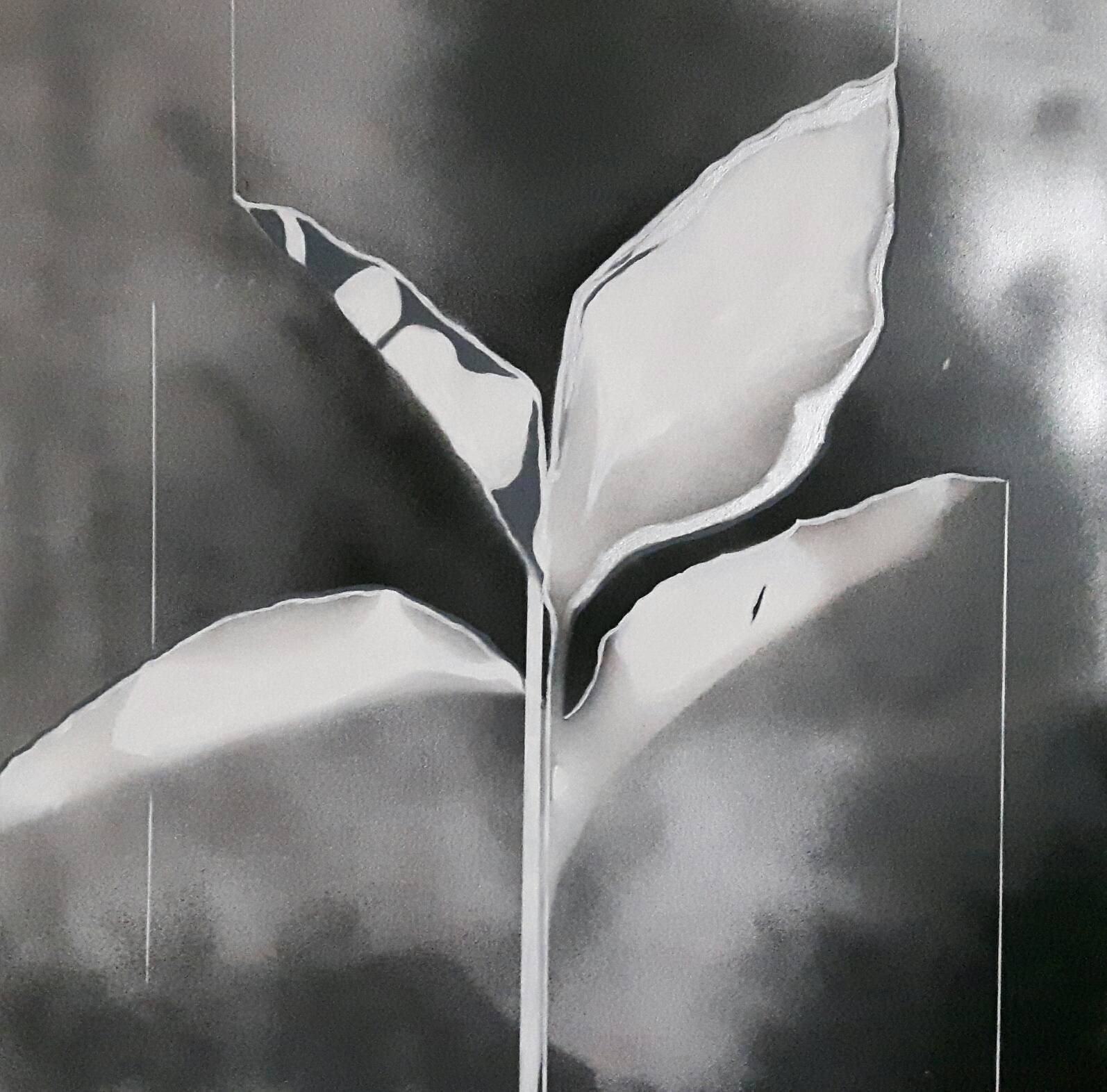 Na obrazie widzimy kompozycję monochromatyczną, gdzie dominują odcienie szarości. Kształty są wyraźne i chłodne, przedstawiając delikatną roślinę z trzema liśćmi. Przyciąga uwagę kontrast między subtelnymi cieniami a wyrazistością konturów. Taka kolorystyka nadaje całości elegancki, almost mysterious wygląd. W powietrzu unosi się spokój i nostalgia, jakby obraz próbował zatrzymać jakieś ulotne piękno natury. Czy artysta użył pędzla czy spreju? Wygląda na to, że zdecydowano się na mieszankę technik, może nawet airbrush, by uzyskać efekt płynnych przejść między odcieniami. Liście wydają się niemalże latające, co przypomina niektóre prace impresjonistów, lecz w modern version. Obraz może budzić wiele emocji. Dla mnie to jak obserwacja ciszy przed burzą. Czasem przypomina, jak ulotne są momenty, które umykają nam w codziennym zgiełku. Czy też tak to czujesz? 7-letnie dziecko powiedziałoby: „Zobacz, jak ten liść jest jak motyl”. Istnieje pewna skromność w tej kompozycji, ale właśnie ta prostota sprawia, że jest tak engaging. Wywołuje refleksje o przemijalności i pięknie małych rzeczy w życiu. Myślę, że ma coś wspólnego z poezją, taką bez słów.