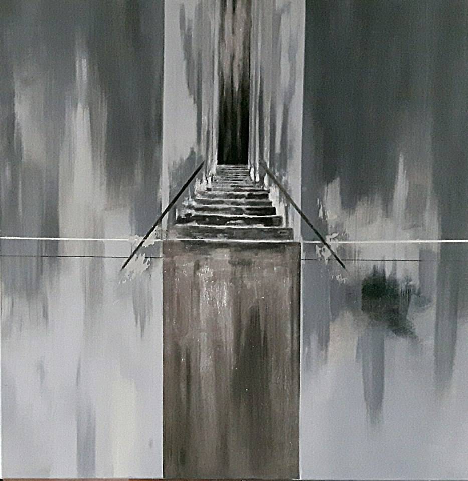 Patrząc na ten obraz, od razu uderza surowość szarości i czerni. Kompozycja jest prosta, lecz intrygująca – schody prowadzące w nieznane. Ciemna szczelina na końcu przyciąga wzrok jak magnes, tworząc tajemniczą atmosferę. Ktoś mógłby powiedzieć: wow, to wygląda jak scena z thrillera. Artysta zastosował smugi i nierówne pociągnięcia pędzla, nadając teksturze szlachetności, a równocześnie coś niepokojącego wisi w powietrzu. Ekspresjonizm miesza się tu z minimalizmem, co przykuwa uwagę na dłużej. Praca z pewnością wywołuje emocje – może strach, niepewność, ale też fascynację. Znalezienie w sobie odwagi, by wspiąć się po tych schodach, to jak podróż w nieznane. Czuje się niczym bohater "adventure", próbujący odkryć sekrety. Dziecko mogłoby powiedzieć: ja bym się bał tam wejść w nocy, boo! Każdy element obrazu współgra z innym, tworząc wciągającą i pobudzająca do refleksji całość. Stylistyczna prostota to siła, która zmusza do zatrzymania się i głębszego wniknięcia. Obraz kusi zagadką i pytaniami, pozostawiając nas w stanie zawieszenia.