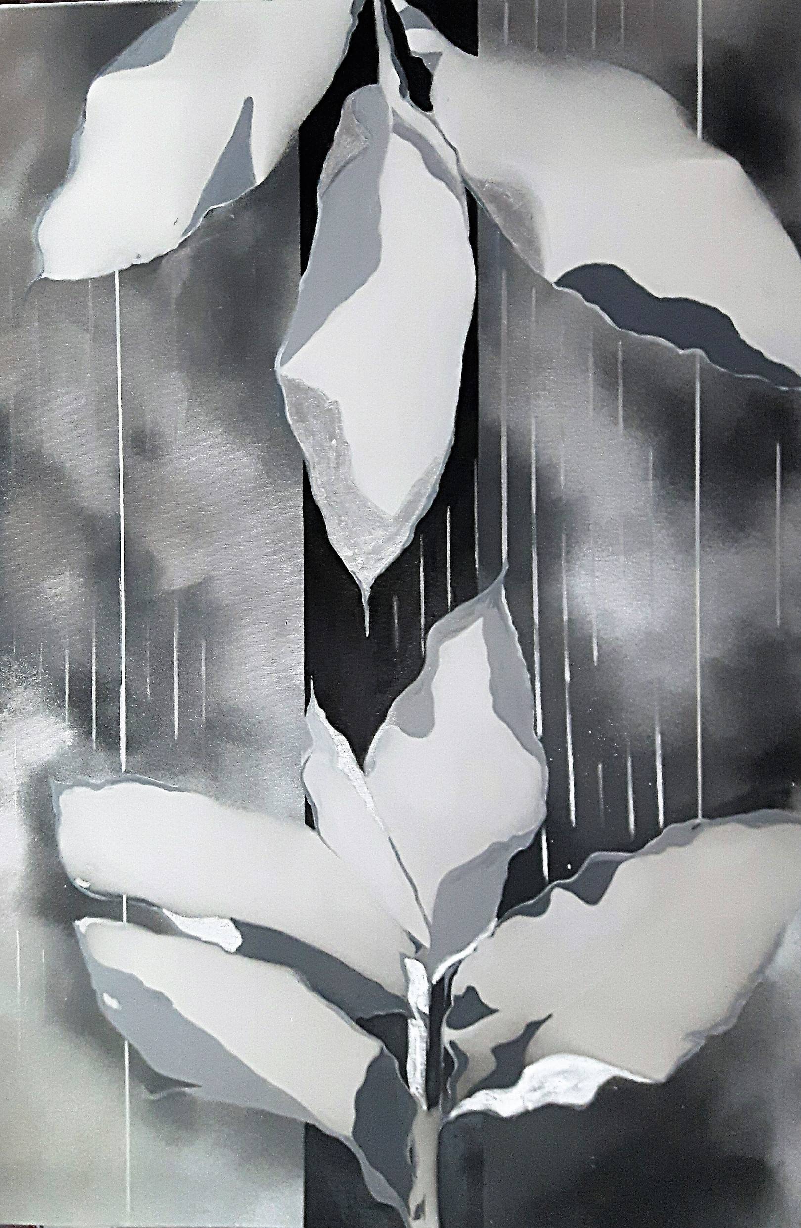 Obraz utrzymany jest w monochromatycznej palecie szarości, co nadaje mu wyrazisty, niemal tajemniczy charakter. Wielkie liście, które dominują w kompozycji, wydają się falować i przepływać przez płótno. Ich kształty są miękkie, jakby rzucano je na wodną taflę, co wprowadza dynamikę do kompozycji. Tło jest niezwykle proste, jednak niebanalne – pionowe linie przypominają deszcz, dodając nieco melancholijnego nastroju. Co za magiczny świat! Całość emanuje spokojem, ale i pewnym niepokojem, jakby niesie coś więcej niż samą estetykę. Styl artystyczny, którym posłużył się twórca, może przypominać abstrakcyjny realizm, łącząc subtelność z ewidentną strukturą. Techniki mieszania farb i gładkie przejścia tonów przywołują wrażenie przestrzenności i głębi. To jest amazing! Patrząc na ten obraz, czujesz, jakbyś patrzył na fragment jakiegoś snu. Możliwe, że u odbiorcy wywołuje to uczucie kontemplacji i zadumy. Może nawet przypominać o chwilach refleksji nad ulotnym pięknem natury. Personalnie, widzę w nim odniesienie do przemijania – liście są elementem żywym, ale w tej formie zdają się trwać poza czasem. Każdy detal, każda kreska zdaje się mieć swoje znaczenie i ciężar, który skłania do refleksji nad przemijającym pięknem.
