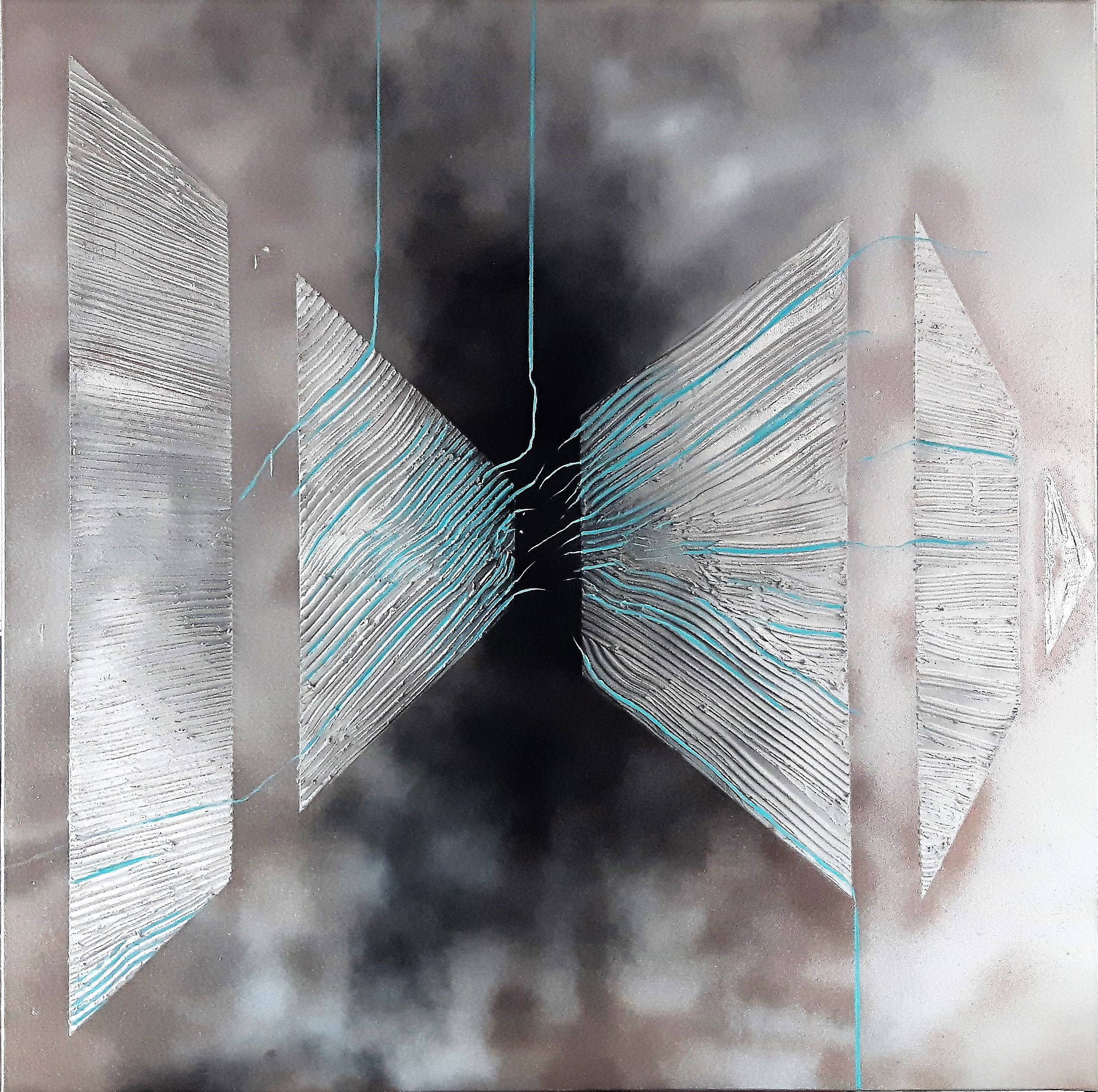 Obraz przedstawia abstrakcyjną kompozycję, która wciąga wzrok dzięki dynamicznym kształtom i delikatnym barwom. Dominują tu szarości i błękity, które w duecie tworzą atmosferę tajemniczości i spokoju. Centralnym punktem są dwie, symetryczne struktury przypominające skrzydła, przecięte jakąś nieznaną siłą. Artysta z precyzją zastosował technikę warstwowania, tworząc iluzję głębi, co dodaje całemu obrazowi trójwymiarowości. Nastrój tego dzieła można opisać jako ethereal. Patrząc na nie, mamy wrażenie, że coś się tutaj dzieje pod powierzchnią, jakby było to zaproszenie do odkrywania nieznanych światów. Użycie subtelnych linii i żłobień nawiązuje do modernistycznych stylów, gdzie forma i przestrzeń odgrywają główną rolę. Moje skojarzenia oscylują wokół poczucia harmonii, choć nieco zakłóconej. Jeśli mam być szczery, wystarczyło spojrzenie i już przypomniałem sobie swoje dziecięce marzenia o lataniu. Spójrz na to! Jak skrzydła motyla, które zaraz uniosą się w powietrzu. Odbiorca może poczuć różnorodne emocje - od zachwytu po zadumę nad tym, co nieznane i niewidoczne. Te magnetyczne błękity od razu zwróciły moją uwagę. Coś jakby szeptały „przyjdź i odkryj”. To dzieło mówi wiele, choć nie używa słów.