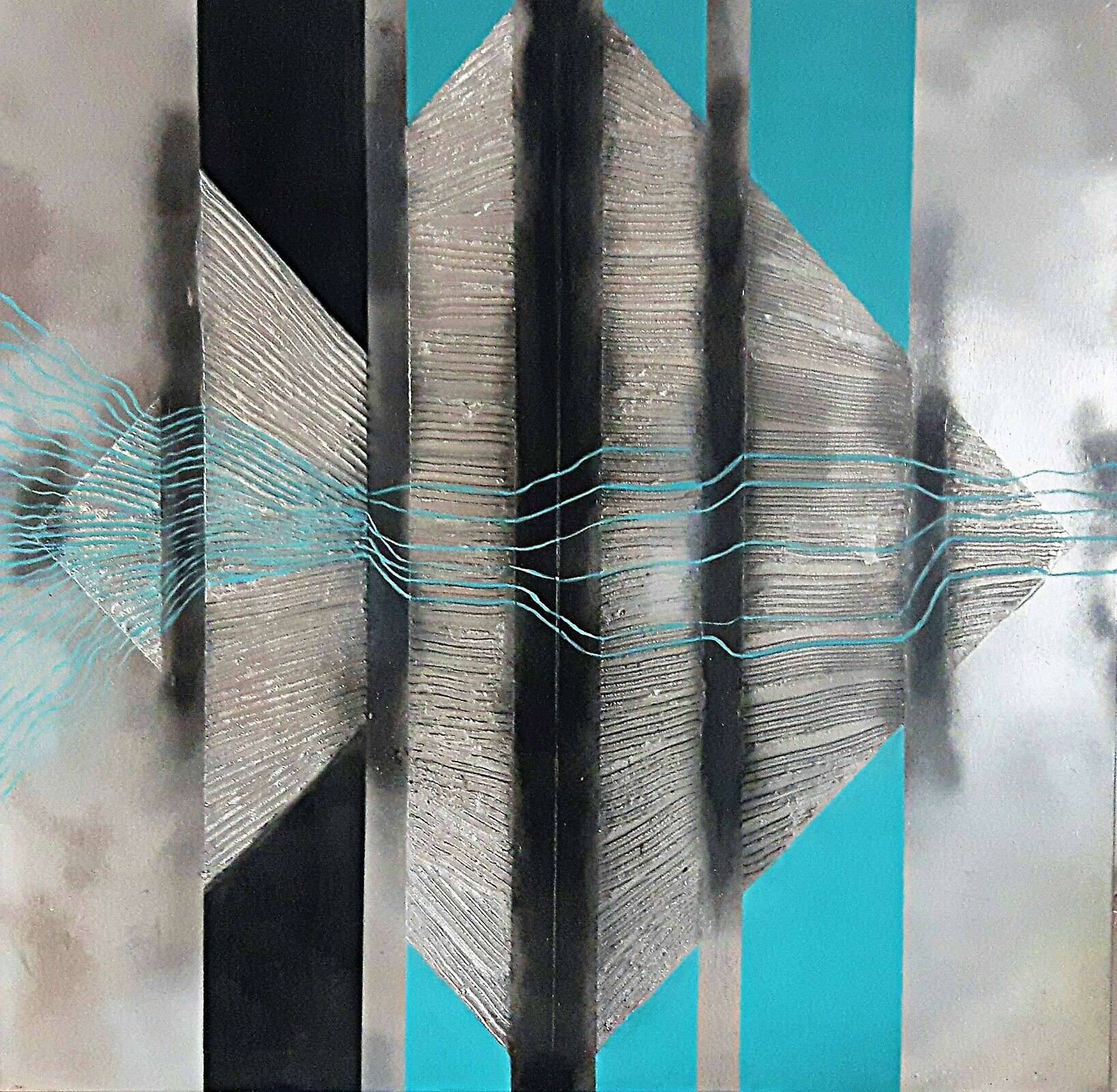 Obraz, który widzimy, to intrygująca kompozycja geometryczna. Dominują w niej turkusowe i srebrne odcienie, które w połączeniu z czernią tworzą dynamiczną całość. Środek zajmuje duży, metaliczny diament, wokół którego rozciągają się smukłe linie przypominające fale. Całość wygląda jak rytmiczny taniec kolorów i kształtów. Atmosfera dzieła jest nieco futurystyczna, jak space odyssey, co sprawia, że odbiorca czuje się jak na granicy nowoczesności i abstrakcji. Styl artysty wydaje się nowoczesny, z elementami kubizmu i minimalizmu. Linia i kolor to główne narzędzia, które pozwalają na stworzenie głębokiego efektu przestrzennego. Technika, której użyto, to prawdopodobnie akryl na płótnie, co daje duże możliwości w manipulowaniu fakturą. Na pierwszy rzut oka można poczuć spokój, ale czy naprawdę? Kompozycja jest intrygująca, jak tajemnicza symfonia, która przyciąga i nie pozwala na zbyt szybkie odejście. Patrząc na obraz, można poczuć różne emocje. Dla mnie to trochę jak wpatrywanie się w zimne, stalowe miasto, które ma swoje ukryte piękno. Jakby każdy miał odnaleźć w tym chaosie coś dla siebie. 7-latek powiedziałby pewnie: "To wygląda jak pokręcone, magiczne miasto". Widok ten może być interpretowany jako zestawienie techniki i natury, co pozostawia duże pole do refleksji. Obraz zachwyca prostotą i głębokością jednocześnie.