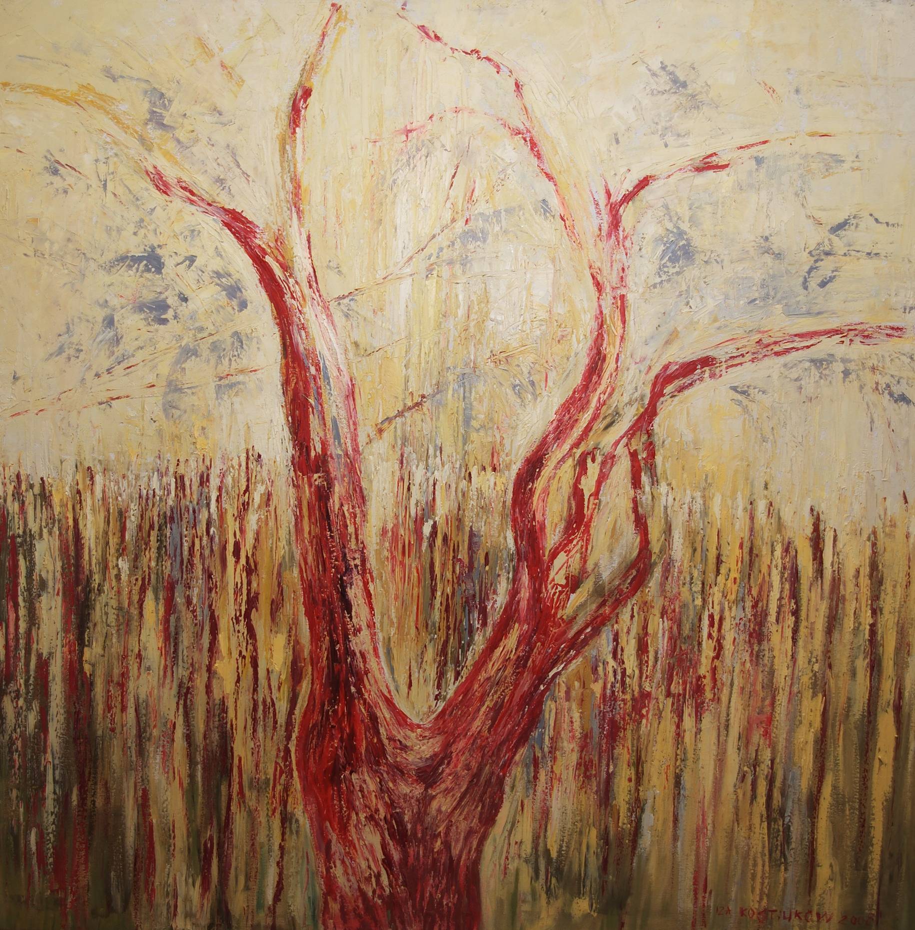 Obraz przedstawia samotne drzewo na tle jasnej, niemal pastelowej przestrzeni. Gałęzie drzewa, wyraziste i krwisto czerwone, kontrastują z miękkim, żółtawo-beżowym tłem. Kompozycja jest dynamiczna, a niemal abstrakcyjne tło przypomina melancholijną interpretację krajobrazu. Kiedy patrzysz na ten obraz, czujesz, jakbyś stał przed symbolicznym światem, gdzie natura opowiada swoją własną historię. Styl artystyczny zbliżony jest do ekspresjonizmu, co podkreśla dynamiczne, szerokie pociągnięcia pędzlem – brush strokes są tutaj bardzo wyraźne. Atmosfera obrazu jest nieco tajemnicza lecz również pełna spokoju, jakby czas się zatrzymał. Czujesz to napięcie między życiem a przemijaniem. Chociaż drzewo wygląda na martwe, jego obecność jest potężna. Odbiorca może zastanowić się nad cyklem życia, zmianami i przemijaniem czasu. To tak, jakby artysta chciał przekazać, że nawet w prostocie możemy znaleźć głęboką, emocjonalną siłę. „To drzewo wygląda tak, jakby miało supermoce!” – powiedziałby pewnie 7-latek, patrząc na tę czerwoną magię. Osobiście, kiedy patrzę na ten obraz, czuję mieszankę nostalgii i podziwu. Artysta, grając kolorami i formą, kapryśnie igra z emocjami odbiorcy, co sprawia, że obraz jest nie tylko wizualnym doznaniem, ale i pretekstem do przemyśleń.