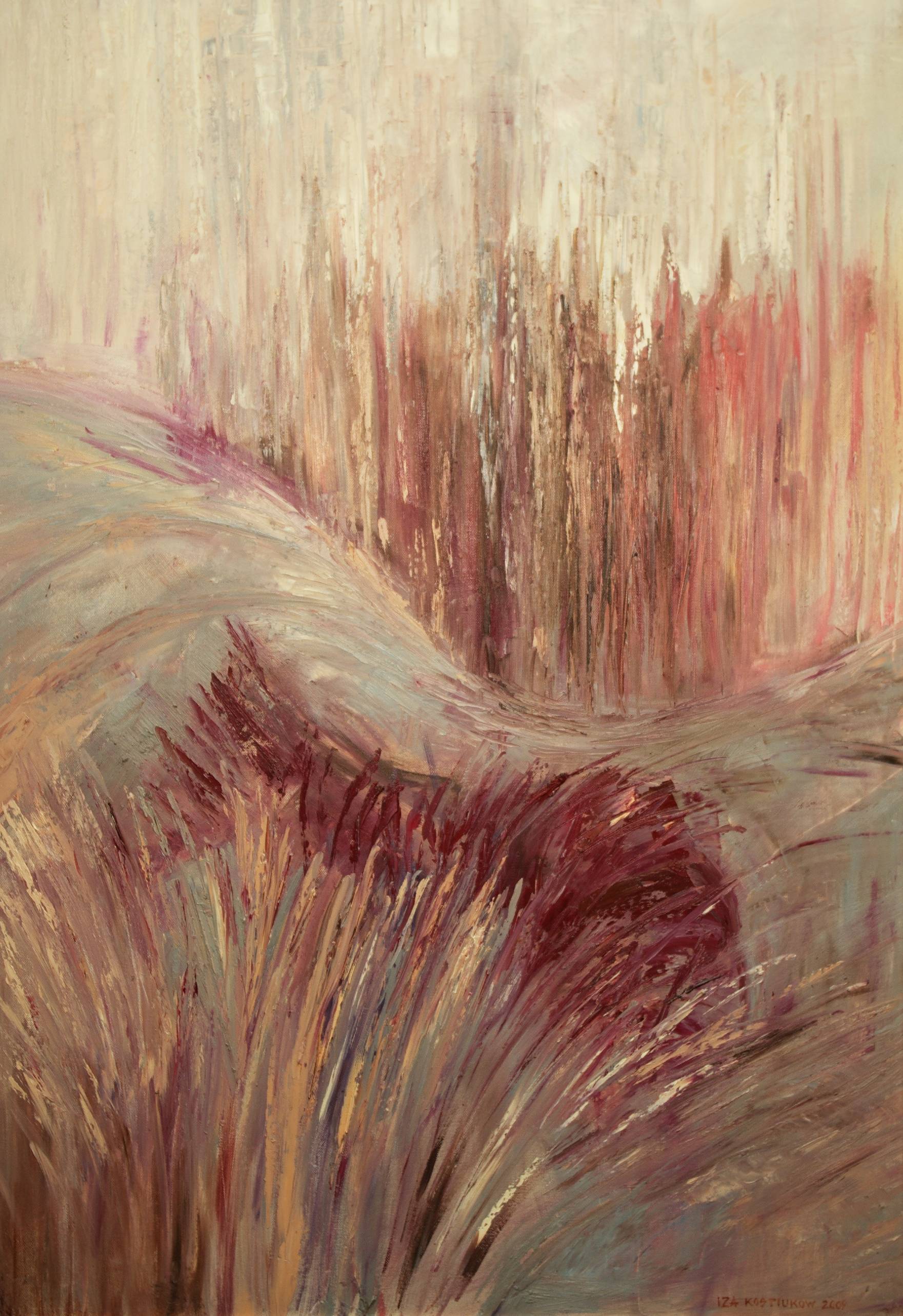 Obraz emanuje ciepłem i delikatnością, jak letni wieczór. Dominują tu miękkie, pastelowe odcienie beżu i bordowe akcenty, tworzące harmonijną kompozycję. Te kolory prowadzą oczy po falujących liniach, jakby wiatr delikatnie przesuwał pola traw. Atmosfera jest spokojna, niemalże medytacyjna. Czujesz to? Jakbyś słyszał szum wiatru. Technika użyta przez artystę zdaje się być impresyjna — dynamiczne, swobodne pociągnięcia pędzla nadają ruch, podczas gdy kolorystyka utrzymuje nastrój spokoju i refleksji. Obraz może budzić uczucie ciepłej nostalgii i tęsknoty za naturą. Może to przypomnieć spacer po dzikich łąkach w dzieciństwie, kiedy świat był prostszy. Kiedy patrzę na ten obraz, czuje się jakbym był częścią tego naturalnego rytmu, co daje mi przyjemne uczucie odprężenia. Może to być również sposób na ucieczkę od miejskiego zgiełku. Artysta chyba chciał uchwycić moment ulotny, moment przejściowy, a jego praca jest w pewnym sensie "timeless". Styl malarski, pełen dynamiki i lekkości, pozwala odbiorcy na własne interpretacje, a przecież to jest właśnie magia sztuki. To także historia, która została opowiedziana bez użycia ani jednego słowa. Prosty, ale głęboki w swojej treści. Jakie emocje wywołuje to w Tobie?