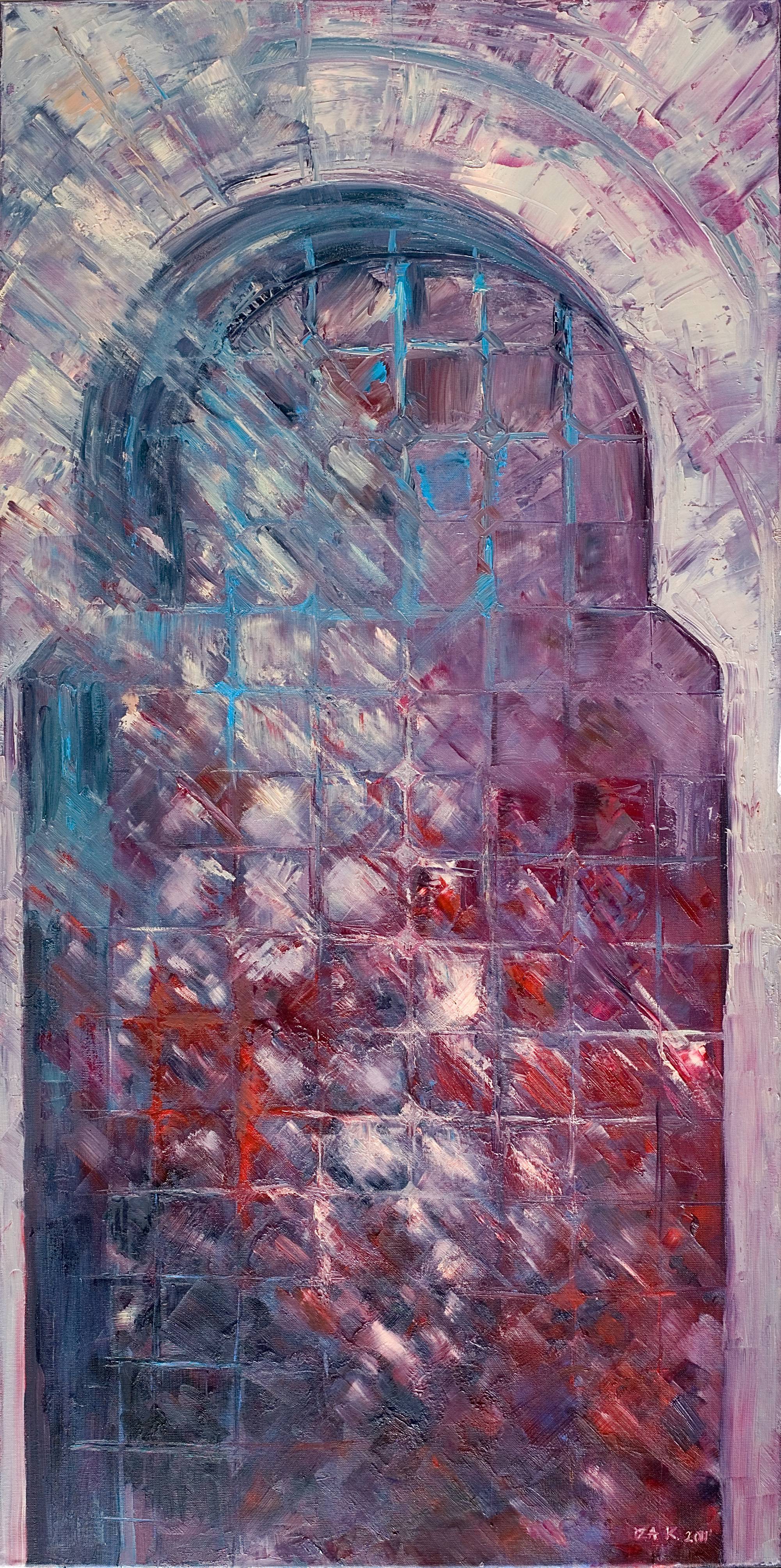 Na obrazie dominuje feeria pastelowych barw. Odcienie fioletu, niebieskiego i czerwieni tworzą intrygującą mozaikę. W centrum znajduje się okno, przypominające witraż, przez które przenikają delikatne promienie światła nadając kompozycji magiczny nastrój. Struktura obrazu jest dynamiczna, pociągnięcia pędzlem są wyraźne i energiczne. To taki look, który sprawia, że czujesz jakby wszystko się poruszało. Technika impasto, gdzie farba kładzie się grubą warstwą, dodaje trójwymiarowości. Obraz emanuje spokojem i jednocześnie pewną tajemniczością. Można poczuć się, jakby stało się w dawnym kościele, gdzie światło zmienia nastrój wnętrza w zależności od pory dnia. Dziś padałem deszczyk - stwierdziłby 7-latek, patrząc na delikatne smugi, które przypominają krople wody na szybie. Artysta wywołuje w odbiorcy refleksję o przemijaniu i ulotności chwili. Ta abstrakcyjna kompozycja zachęca do zatrzymania się na moment i zadumy nad pięknem aspektów codzienności. Fascynująca gra kolorów jest niczym podróż w głąb marzeń.