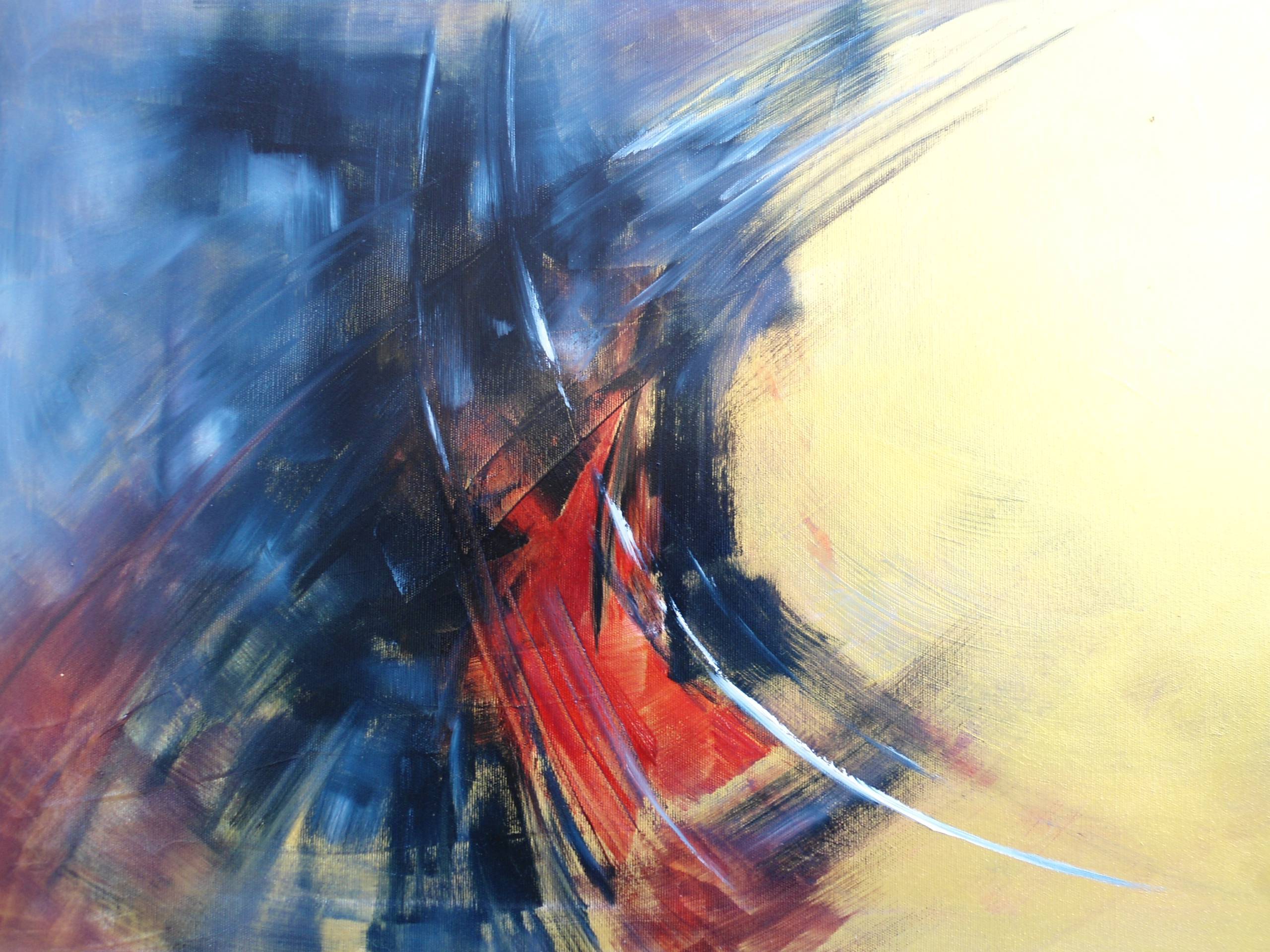Obraz tętni życiem kolorów i dynamicznych kształtów. Dominują głęboki błękit, intensywna czerwień i delikatny żółty, które nakładają się na siebie, tworząc wirujące formy. Praca jest pełna energii, jakby chciała wybuchnąć z płótna. Nastrój zdaje się być nieco niepokojący, ale jednocześnie intrygujący, jakby skrywał jakąś tajemnicę. Styl malarski przypomina abstrakcyjny ekspresjonizm, z widocznymi pociągnięciami pędzla, które układają się w chaotyczny taniec. Artysta zastosował technikę impastu, co dodaje tekstury i głębi. Obraz może budzić różne emocje - od niepokoju po fascynację. Patrząc na tę pracę, czuję nutkę ekscytacji. Może ci się wydawać, że zagubisz się w tych barwach, a potem nagle odkrywasz w nich porządek. Super magiczny świat! Dla niektórych może stanowić moment refleksji nad chaosem otaczającego świata. Hey, sztuka taka jest - zaskakuje! Każdy kąt tej kompozycji może prowokować do zadawania pytań i odkrywania coraz to nowych interpretacji.