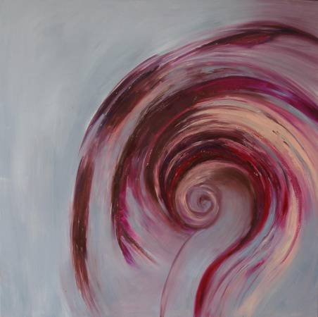 Obraz wybucha kolorami, głównie odcieniami czerwieni, różu i brązu, które wirują w formie spiralnej kompozycji. Użycie pociągnięć pędzla tworzy uczucie ruchu, jakby wszystko tańczyło przed oczami. Dominujący jest tu chaos, ale taki przyjemny, jakby ktoś chciał nam coś opowiedzieć bez używania słów. Ciepłe kolory emanują energią i pasją, a jednocześnie wydają się otulać widza miękkim uściskiem. Patrzenie na ten obraz przypomina mi trochę roller coaster w szklanym tunelu. Atmosfera jest dynamiczna i pełna życia, choć pojawia się momentami nutka tajemnicy. Kto wie, co się kryje w samym środku tej wirującej formy? Styl artystyczny jest nowoczesny, może nawet trochę awangardowy, a techniki malarskie ukazują biegłość artysty w operowaniu kolorami i formą. Na myśl przychodzi „movement”, to jeden z najlepszych wyrazów, żeby opisać to, co się dzieje na płótnie. Obraz może wywołać różne emocje: od radości po zadumę. Dla mnie to trochę jak widok na kosmiczną galaktykę. Wow, mamo, ale to kawałek sztuki! Może dla niektórych cała ta wirująca kompozycja przypomina podróż w głąb własnych myśli lub emocji. To jest fascynujące, jak dzieło może wciągnąć nas w swój świat i zabrać na chwilę gdzieś daleko od codzienności.