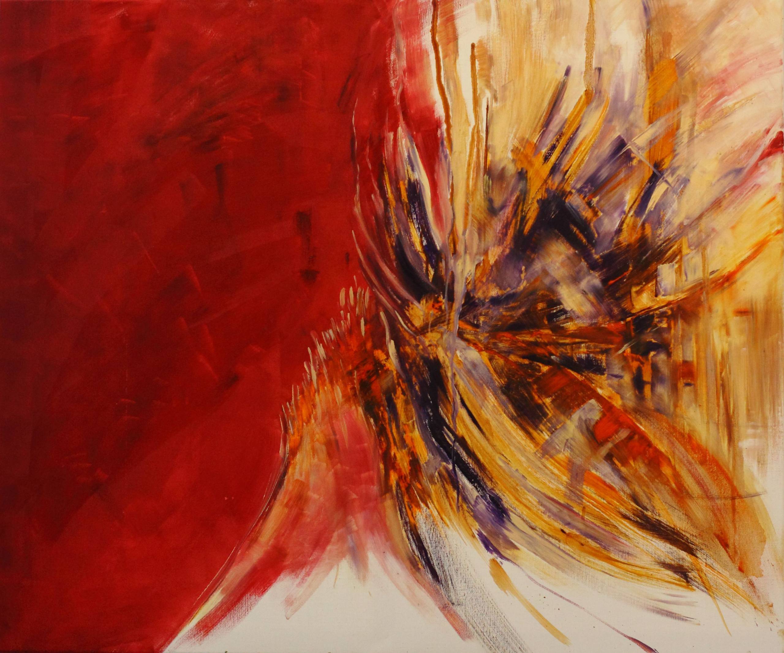 Obraz na pierwszy rzut oka uderza intensywną czerwienią po lewej stronie, która stopniowo przechodzi w mieszankę ciepłych odcieni żółci i pomarańczy, tworząc dynamiczną kompozycję pełną energii. Wyraźne pociągnięcia pędzla, niczym eksplozja, tworzą kształty przypominające ptasie pióra lub płomienie. Ten chaos kształtów i barw wzbudza uczucie niepokoju, jakby obraz był na granicy wybuchu emocji. Artysta zastosował technikę ekspresjonizmu abstrakcyjnego, co widać w emocjonalnym oddaniu ruchu. Atmosfera obrazu jest burzliwa i dramatyczna. Czuć tu napięcie, ale i pewną fascynację dynamiką, która wydaje się opowiadać historię zmagań wewnętrznych. Obraz przemawia swoją dziką energią, rozbudzając w odbiorcy poczucie niepewności, ale i zachwytu nad pięknem chaosu. Wow, te kolory to jak wybuchające fajerwerki! Obserwując to dzieło, myślę o tym, jak czasem życie jest podobne. Pełne nagłych zrywów, nieprzewidywalnych zwrotów. Emocje kotłują się w nas jak te farby na płótnie. Słowo, które przychodzi mi na myśl, to "intensity". Jest w tym obrazie coś prawdziwego i surowego. Może nawet każdego dnia czujemy coś podobnego, kiedy zmagamy się z codziennymi radościami i troskami.