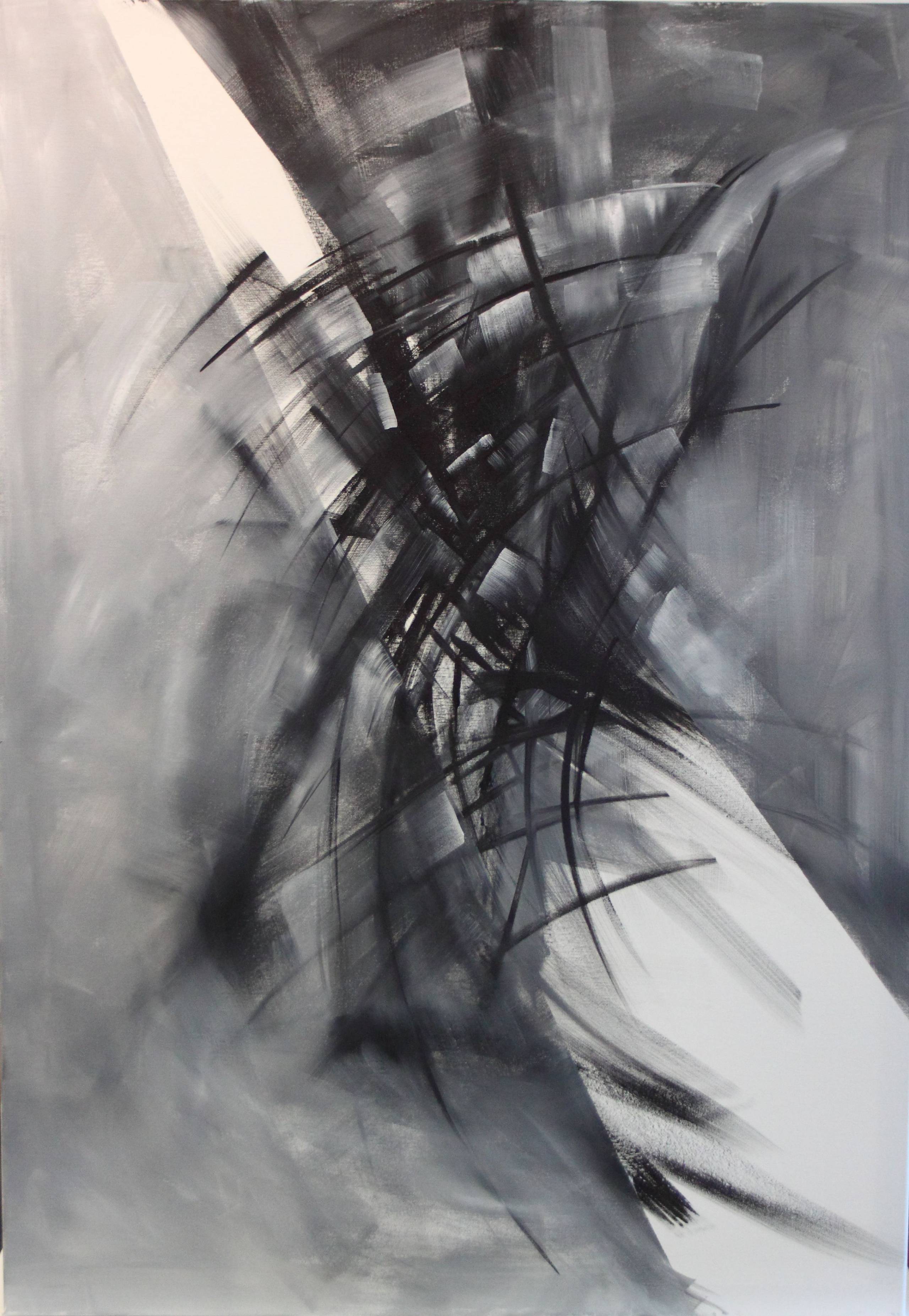 Obraz, który mamy przed sobą, to prawdziwa uczta dla oka. Dominują na nim odcienie szarości, czerni i bieli, tworząc dynamiczną kompozycję pełną ruchu i chaosu. Smugi i linie biegną we wszystkich kierunkach, jakby właśnie odbywał się taniec światła i cienia. Ta abstrakcyjna eksplozja kształtów sprawia, że obraz wydaje się być w wiecznym ruchu, jakby miał zaraz wyskoczyć z ramy. No, powiem Ci, że przykuwa uwagę! Atmosfera jest tajemnicza i nieco mroczna, jakby stanowiła część jakiegoś snu lub wizji. Styl tego dzieła to czysta abstrakcja, a artysta wykorzystał tu technikę szczotkowania i smugowania, co daje efekt płynności i ulotności. Mam wrażenie, że pod ręką artysty pędzel tańczył jak w rytm ulubionego utworu. Ten obraz może budzić różnorakie emocje. Może to być niepokój związany z chaosem, ale też zachwyt nad jego pięknem. U odbiorcy wywołuje poczucie zagubienia, ale też fascynację – co więcej można powiedzieć? Dzieciak pewnie powiedziałby: „To wygląda jak burza!”. Osobiście czuję się trochę jak w podróży przez tornado myśli. This piece really captivates. Te przenikające się kształty i linie zdają się opowiadać historię nie do końca zrozumiałą, ale niesamowicie pociągającą.